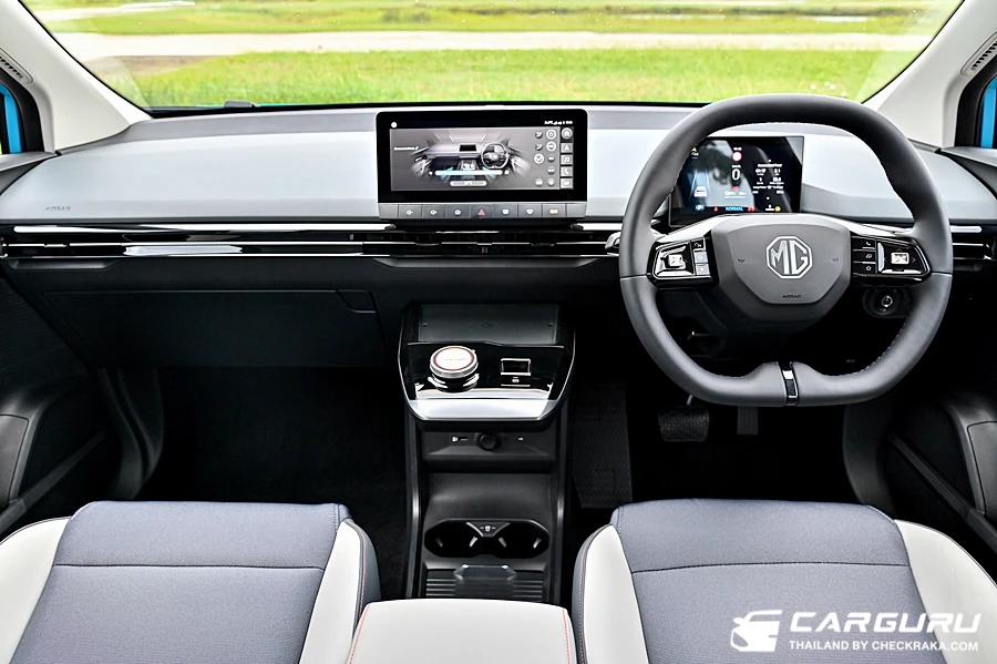 สายสปอร์ตชอบรถซิ่งหรือแต่งแบบรถแข่งมาทางนี้เลย MG4 เค้าตั้งใจให้เป็นรถทรงสปอร์ตปราวเปรียวคล่องตัว ภายในจึงดูมีความเป็นเหลี่ยมสัน โดยเฉพาะพวงมาลัยหัวท้ายตัด ยิ่งได้อารมณ์รถสปอร์ตแท้ ๆ แต่อาจจะขับขี่ลำบากหน่อยต้องค่อย ๆ ปรับตัวไป ส่วนสีสันเรียบ ๆ เน้นสปอร์ตด้วยสีดำหรือรุ่นท็อปก็จะเป็นสีดำสลับขาวด้ายแดง