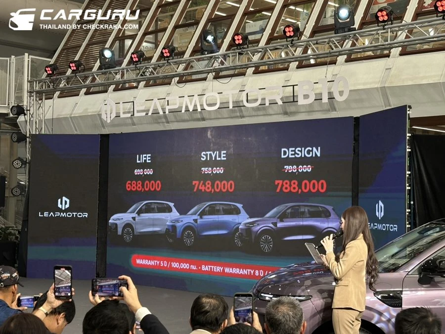 Leapmotor Thailand ประกาศความพร้อมเดินหน้าบุกตลาดรถยนต์ไฟฟ้า กลุ่ม C-Segment ในประเทศไทย ด้วยการเปิดตัวรถยนต์ไฟฟ้ารุ่นใหม่ล่าสุด Leapmotor B10 ทั้ง 3 รุ่นย่อย ได้แก่รุ่น Life, Style และ Design มาพร้อมแบตเตอรี่ขนาด 56.2 kWh และขนาด 67.1 kWh ระยะทางในการขับขี่ 442 km. และ 516 km. ตามมาตรฐาน NEDC สัมผัสสมรรถนะการขับขี่ที่ปรับจูนโดยทีมวิศวกรของ Stellantis และเทคโนโลยี Cell-To-Chassis 2.0 และระบบปฏิบัติการ LEAP3.5 รองรับ Apple Carplay และ Android Auto และการอัปเดตซอฟต์แวร์แบบ OTA ใหม่ล่าสุด