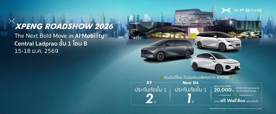 เชิญสัมผัสและทดลองขับ เอ็กซ์เผิง ทุกรุ่น ได้ที่งาน XPENG ROADSHOW 2026 ระหว่างวันที่ 15-18 มกราคม 2569 ชั้น 1 โซน B ศูนย์การค้าเซ็นทรัล ลาดพร้าว และโชว์รูม เอ็กซ์เผิง ทั้ง 15 สาขา ทั่วประเทศ