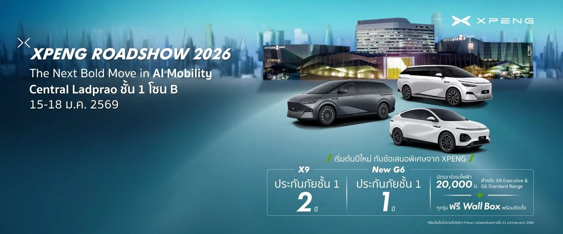 เชิญสัมผัสและทดลองขับ เอ็กซ์เผิง ทุกรุ่น ได้ที่งาน XPENG ROADSHOW 2026 ระหว่างวันที่ 15-18 มกราคม 2569 ชั้น 1 โซน B ศูนย์การค้าเซ็นทรัล ลาดพร้าว และโชว์รูม เอ็กซ์เผิง ทั้ง 15 สาขา ทั่วประเทศ
