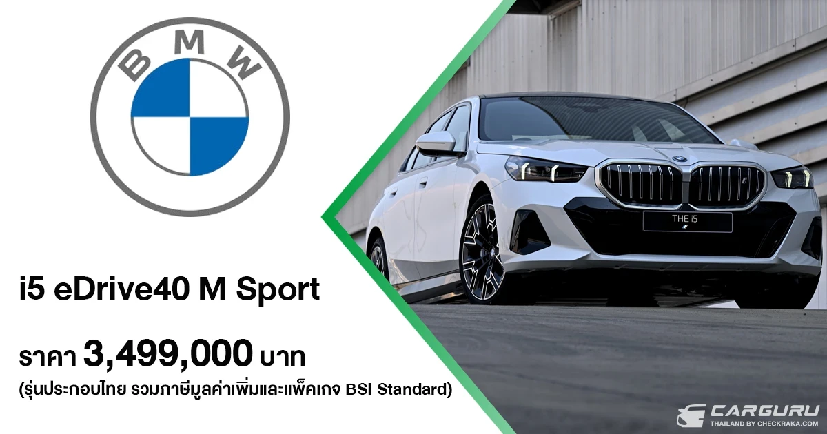 บีเอ็มดับเบิลยู i5 eDrive40 M Sport ใหม่ พร้อมให้เป็นเจ้าของแล้ววันนี้ โดยมีให้เลือก 5 สี ดำ Black Sapphire Metallic, ขาว Mineral White Metallic, เทา Brooklyn Grey Metallic, น้ำเงิน Phytonic Blue Metallic และ เขียว Cape York Green Metallic ราคา3,499,000 บาท (รวมภาษีมูลค่าเพิ่มและแพ็คเกจ BSI Standard)