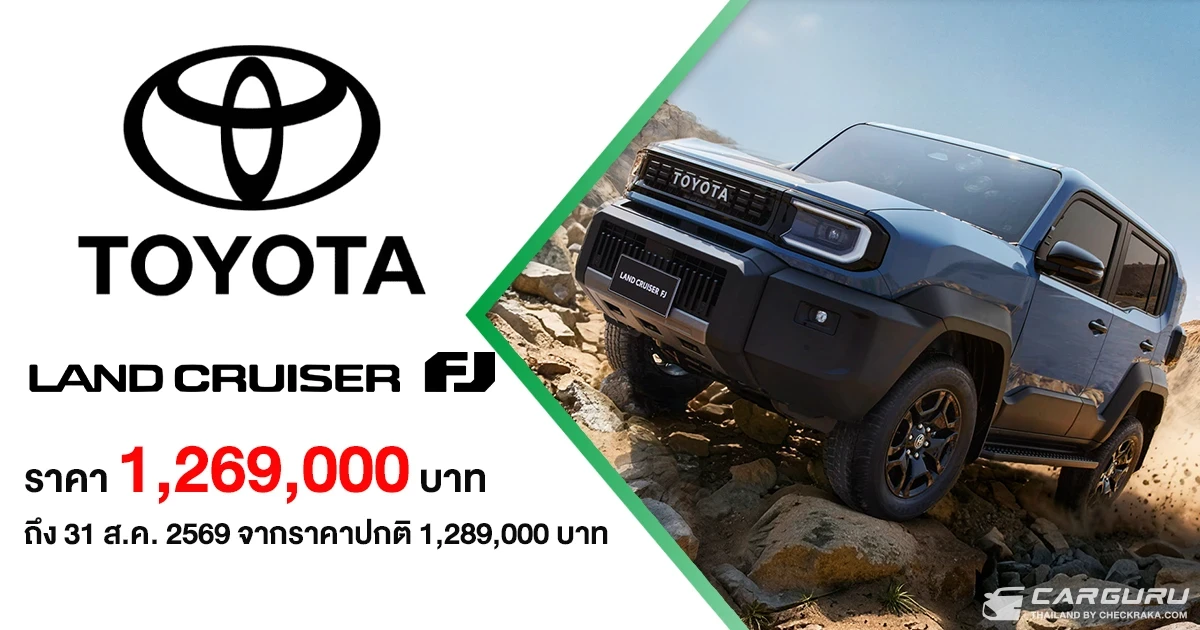 Land Cruiser FJ เปิดตัวด้วยรุ่นย่อย 4WD พร้อมตัวเลือกสีและอุปกรณ์ต่าง ๆ ตามที่นำเสนอภายในงาน โดยมีราคาอย่างเป็นทางการ 1,289,000 บาท (ราคาเต็ม) พิเศษสุด! กับราคาเริ่มต้นช่วงเปิดตัว 1,269,000 บาท (ถึงวันที่ 31 สิงหาคม 2569)
