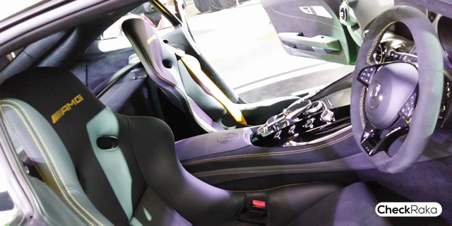 ภายในได้รับอิทธิพลมาจากกีฬามอเตอร์สปอร์ต โดยเบาะนั่งถูกปรับให้ต่ำลงเพื่อให้ผู้ขับรู้สึกเป็นหนึ่งเดียวกับตัวรถ และยังเป็นเบาะนั่งแบบ AMG Sports Bucket หุ้มด้วยหนัง Nappa และเส้นใย DINAMICA Microfibre ช่วยปกป้องลำตัวด้านข้างได้ดีแม้จะขับขี่ในความเร็วสูง โดยที่ผู้เป็นเจ้าของสามารถเลือกติดตั้งเบาะแบบ AMG Performance และอุปกรณ์เสริมต่างๆ ได้ อาทิ เข็มขัดนิรภัยสีเหลือง ชุดแผงหน้าปัดสีเหลือง หรือชุดแต่งห้องโดยสาร AMG Interior Night ได้