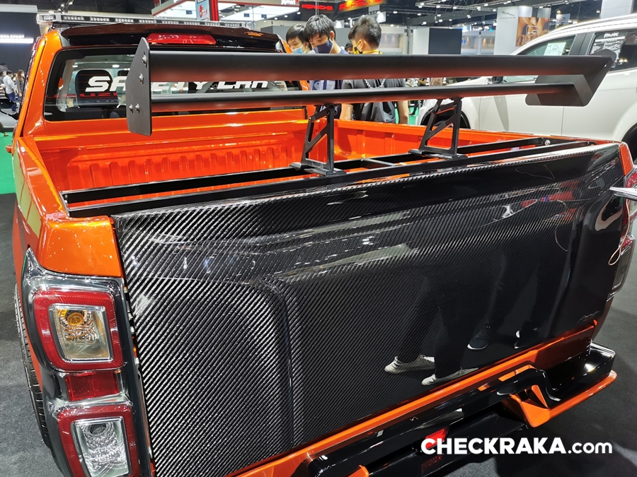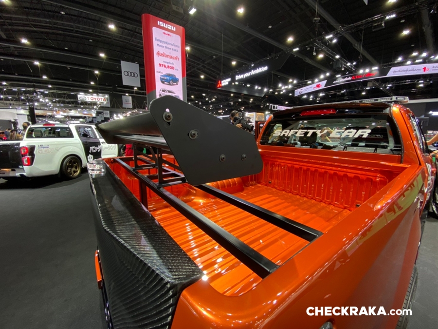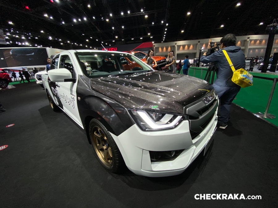 รถยนต์อีซูซุคันนี้บอดี้พาร์ทภายนอกทั้งคันให้มีความสปอร์ต โฉบเฉี่ยว พร้อมติดตั้งฝากระโปรงหน้าฝาปิดกระบะท้าย กระจกมองข้างทรงสปอร์ต สปอยเลอร์หลังคาด้วย Akana Carbon Composite เท่อย่างลงตัวด้วยล้ออัลลอย PP Super Wheels ล้อหน้า 9.5 นิ้ว ล้อหลัง 10.5 นิ้ว พร้อมยาง Toyo Tire T-1S ยางหน้า 245/45R18 ยางหลัง 275/40R18 ดิสก์เบรก 4 ล้อจาก Run Stop แบบ 6 พ็อต ขนาด 355 มม. ชุดโหลดช่วงล่างจาก Hot bits เสริมความแรงด้วยกล่อง ECU Shop รุ่น Ultra Boost ให้กำลังสูงสุด 350 แรงม้า แรงบิดสูงสุด 600 นิวตัน-เมตร ตอกย้ำความเป็นผู้นำด้านสมรรถนะและความแรง ถ่ายทอดกำลังเครื่องยนต์ได้เต็มประสิทธิภาพด้วยชุดคลัชท์ BRC และท่อไอเสีย Nitto ตลอดจนอุปกรณ์เพื่อความปลอดภัยครบครัน เช่น Roll Cage เบาะรถแข่ง Sparco เข็มขัดนิรภัย HC Group พวงมาลัย Sparco เป็นต้น