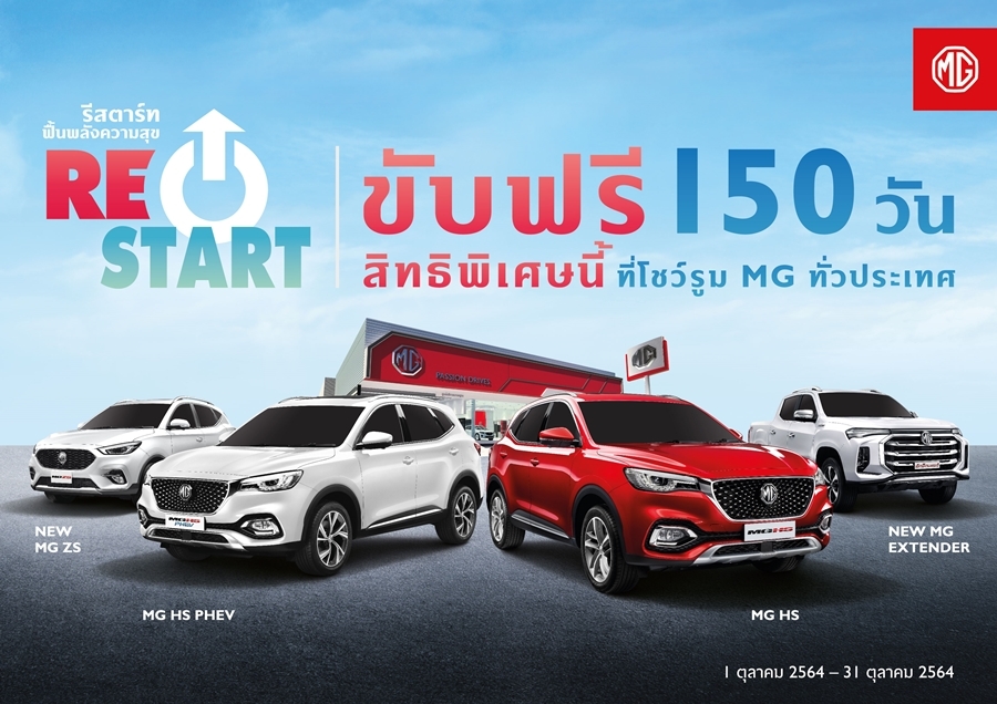 "เราคาดการณ์ว่าในไตรมาสสุดท้ายของปีนี้ เศรษฐกิจในประเทศจะฟื้นตัวและสถานการณ์โควิด-19 จะคลี่คลายไปในทิศทางที่ดีขึ้น โดยเอ็มจีขอเป็นส่วนหนึ่งในการฟื้นพลังความสุขให้กับคนไทย ช่วยลดภาระค่าใช้จ่ายให้กับลูกค้าด้วยการจัดทำแคมเปญพิเศษ RESTART - รีสตาร์ท ฟื้นพลังความสุข ให้ลูกค้าได้ขับฟรี 150 วันก่อนเริ่มผ่อนชำระงวดแรกสำหรับรถยนต์รุ่น MG ZS, MG HS, MG HS PHEV และรถกระบะ MG EXTENDER และยังมีข้อเสนอพิเศษอื่นๆ ตลอดเดือนตุลาคมนี้ สำหรับผู้ที่สนใจสามารถติดตามรายละเอียดได้จากช่องทางการสื่อสารต่างๆ ของบริษัทฯ และที่ผู้จำหน่ายเอ็มจี กว่า 150 แห่งทั่วประเทศครับ" นายพงษ์ศักดิ์ กล่าวสรุป