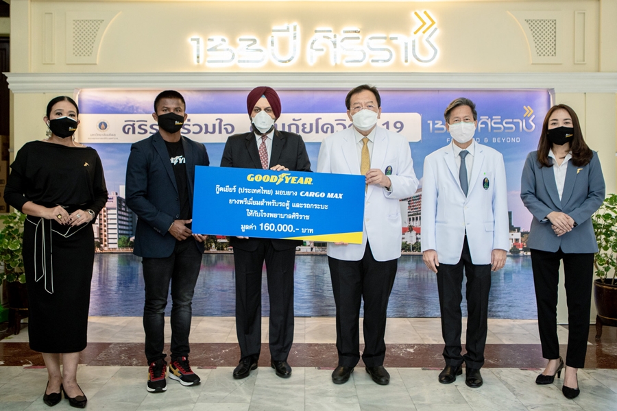 บริษัท กู๊ดเยียร์ (ประเทศไทย) จำกัด (มหาชน) นำโดย นายแรนดีพ ซิง กานวา (ที่สามจากซ้าย) กรรมการผู้จัดการ ร่วมกับ บัวขาว บัญชาเมฆ (ที่สองจากซ้าย) สุดยอดนักมวยไทยขวัญใจมหาชนและพรีเซนเตอร์ยาง Goodyear Cargo Max ส่งมอบยางรุ่น กู๊ดเยียร์ คาร์โก้ แมกซ์ให้กับโรงพยาบาลศิริราชเพื่อนำไปใช้กับรถพยาบาลเพื่อความปลอดภัยในทุกเส้นทางการรับ-ส่งผู้ป่วย โดยมี รศ.นพ.วิศิษฎ์ วามวาณิชย์ (ที่สามจากขวา) ผู้อำนวยการโรงพยาบาลศิริราช และ ผศ.นพ.ธารา วงศ์วิริยางกูร (ที่สองจากขวา) รองผู้อำนวยการโรงพยาบาลศิริราช เป็นผู้แทนรับมอบ