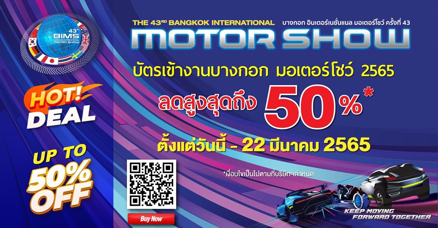 https://motorshow-online.com ตั้งแต่วันนี้-22 มีนาคม 2565 โดยผู้ที่ซื้อบัตรล่วงหน้าจะได้รับ QR Code เพื่อนำไปแสดงให้เจ้าหน้าที่บริเวณประตูทางเข้าหลักของอาคารชาเลนเจอร์ 1-3 รวมทั้งการจำหน่ายบัตรเข้าชมงานผ่านทางแอปพลิเคชั่น K-Plus การแลกคะแนนสะสมจากบัตรเครดิต KTC และช่องทางออนไลน์อื่นๆ