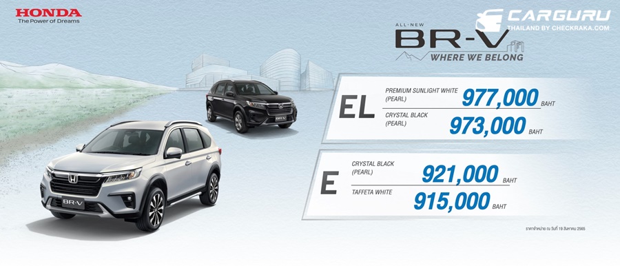 โดย ฮอนด้า บีอาร์-วี ใหม่ มีให้เลือกทั้งหมด 2 รุ่นย่อย ได้แก่ รุ่น EL ราคาเริ่มต้น 973,000 บาท และรุ่น E ราคาเริ่มต้น 915,000 บาท มาพร้อมข้อเสนอพิเศษดอกเบี้ย 0.99% พร้อมรับฟรีบัตรน้ำมัน มูลค่า 5,000 บาท และฟรีค่าแรงในการเช็กระยะตามตารางการบำรุงรักษา 2 ปี 6 เดือน หรือ 50,000 กิโลเมตร (อย่างใดอย่างหนึ่งถึงก่อน) มูลค่า 2,915 บาท เมื่อจองและรับรถยนต์ตั้งแต่วันที่ 19 สิงหาคม 2565 – 30 กันยายน 2565
