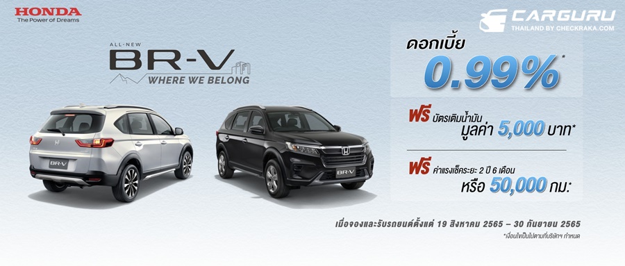- ฮอนด้า บีอาร์-วี ใหม่ รับข้อเสนอพิเศษดอกเบี้ย 0.99% พร้อมรับฟรีบัตรน้ำมัน มูลค่า 5,000 บาท และฟรีค่าแรงในการเช็กระยะตามตารางการบำรุงรักษา 2 ปี 6 เดือน หรือ 50,000 กิโลเมตร (อย่างใดอย่างหนึ่งถึงก่อน) มูลค่า 2,915 บาท เมื่อจองและรับรถยนต์ตั้งแต่วันที่ 19 สิงหาคม 2565 – 30 กันยายน 2565