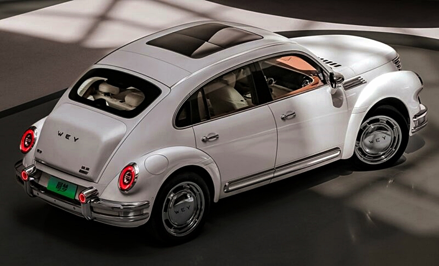 WEY Yuanmeng Hybrid ผสานความร่วมสมัยซึ่งหากมองผ่าน ๆ อาจดูเหมือนเป็นรถเก่าจริง ๆ แหละ ทั้งไฟหน้าทรงกลมซู้มล้อที่โค้งขนาดใหญ่ กระจังหน้าและฝากระโปรงที่ดูยังไงก็เป็นรถยุคโบราณที่เน้นเส้นสายโค้งมนและตกแต่งด้วยโครเมี่ยมรอบคัน