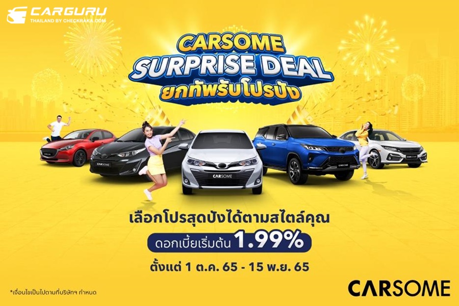 ลูกค้าที่ซื้อรถยนต์มือสองกับ CARSOME จะได้รับสิทธิประโยชน์มากมายจากแคมเปญ Surprise Deal ซึ่งจะมีถึงวันที่ 15 พฤศจิกายน 2565 นี้เท่านั้น โดยลูกค้าของ CARSOME จะได้รับดอกเบี้ยอัตราเริ่มต้นเพียงแค่ 1.99% จากลีสซิ่งกสิกรไทย หรือเลือกรับส่วนลดสูงสุด 20,000 บาท ขยายเวลารับประกัน 2 ปี หรือ 40,000 กิโลเมตร พร้อมรับฟรีกล้องติดรถยนต์จาก Xiaomi เมื่อโพสต์รีวิวบนเพจเฟสบุ๊ค CARSOME Thailand และส่วนลดพิเศษสำหรับแพ็กเกจตรวจสภาพรถจาก FIT Auto โดย บริษัท ปตท. น้ำมันและการค้าปลีก จำกัด (มหาชน) หรือ OR อ่านรายละเอียดและเงื่อนไขเพิ่มเติมเกี่ยวกับแคมเปญ Super Deal ได้ ที่นี่