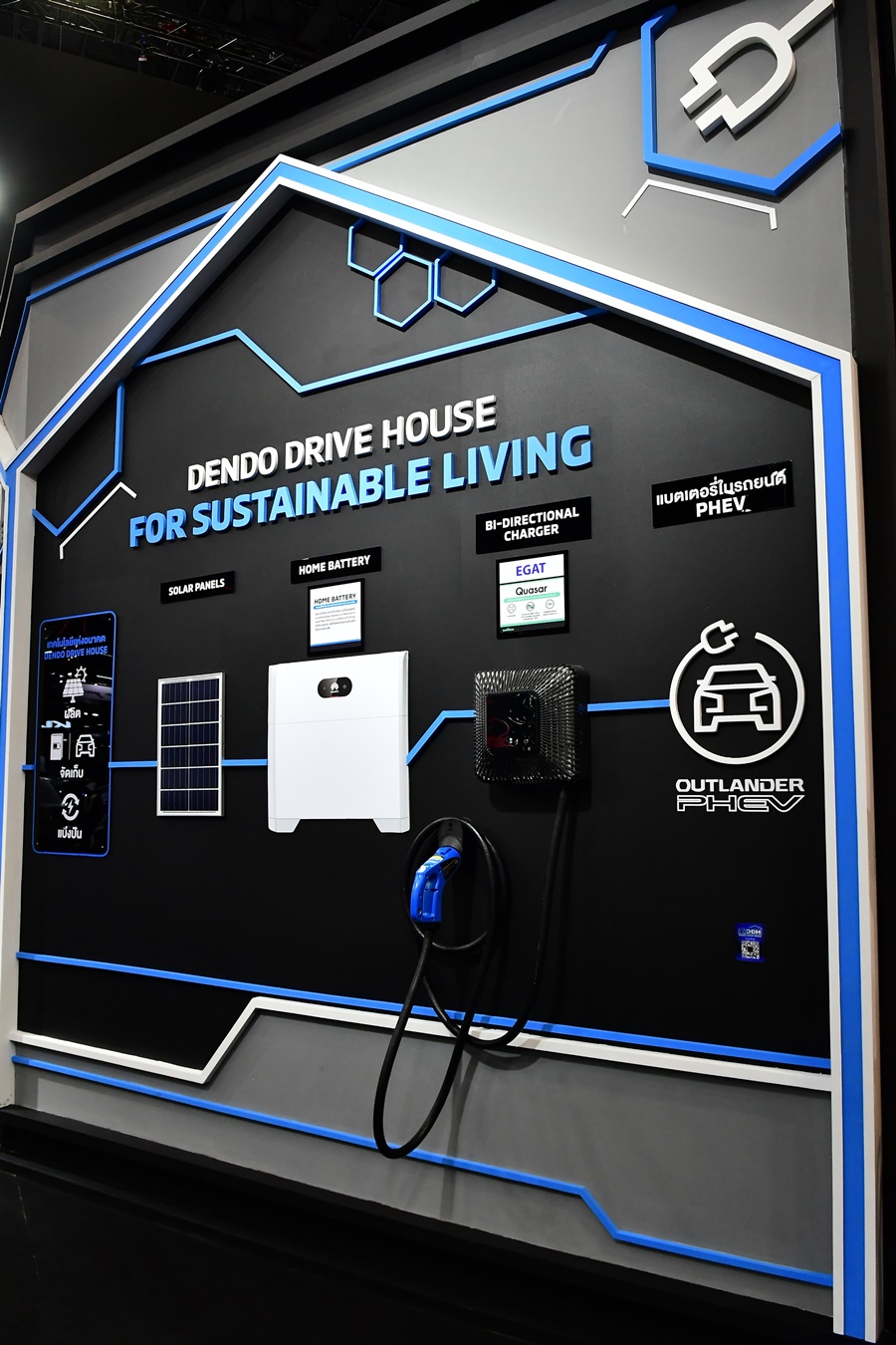 เทคโนโลยีเดนโด ไดร์ฟ เฮ้าส์ พัฒนาโดยมิตซูบิชิ มอเตอร์ส คือ นวัตกรรมบริหารจัดการระบบนิเวศของพลังงานไฟฟ้าด้วยการผลิต-จัดเก็บ-และแบ่งปันพลังงานไฟฟ้าโดยเปลี่ยนพลังงานแสงอาทิตย์มาเป็นกระแสไฟฟ้าผ่านแผงโซลาร์ ระบบนี้ประกอบด้วยรถยนต์ปลั๊กอินไฮบริด (พีเอชอีวี) เครื่องชาร์จไฟสองทิศทาง แผงโซลาร์ และแบตเตอรี่สำรองสำหรับใช้ภายในบ้าน (Energy Storage System หรือ ESS) เทคโนโลยีนี้ช่วยให้ผู้ขับขี่ มิตซูบิชิ เอาท์แลนเดอร์ พีเอชอีวี สามารถชาร์จรถยนต์ของตนเองด้วยการใช้ไฟจากระบบไฟฟ้าและจ่ายไฟฟ้าจากรถยนต์กลับสู่บ้านได้ นอกจากช่วยประหยัดค่าน้ำมันแล้ว “เดนโด ไดร์ฟ เฮ้าส์” ยังช่วยให้เจ้าของบ้านประหยัดค่าไฟฟ้าด้วยการใช้ไฟฟ้าที่เหลืออยู่ในแบตเตอรี่สำรองสำหรับใช้ภายในบ้านหรือแบตเตอรี่ของรถยนต์ อีกทั้งยังเป็นแหล่งพลังงานสำรองที่ไว้วางใจได้ในกรณีที่เกิดเหตุฉุกเฉินหรือเมื่อเกิดไฟดับ