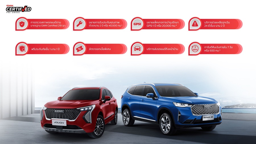 เกรท วอลล์ มอเตอร์ ในฐานะบริษัทที่ให้บริการเทคโนโลยีอัจฉริยะระดับโลก (Global Intelligent Technology Company) พร้อมมอบความเชื่อมั่นและความสะดวกสบายให้แก่เหล่าผู้ที่หลงไหลในรถยนต์พลังงานไฟฟ้า ด้วยบริการครบวงจรอย่าง GWM Certified Pre-Owned พร้อมด้วยแพ็กเกจเสริมและสิทธิประโยชน์มากมาย เพื่อยกระดับมาตรฐานรถยนต์ใช้แล้วคุณภาพสูง เกรท วอลล์ มอเตอร์ ยังมุ่งมั่นที่จะผลักดันและสานต่อการสร้างระบบนิเวศทางยานยนต์ไฟฟ้าของไทยอย่างต่อเนื่อง ซึ่งจะช่วยยกระดับอุตสาหกรรมยานยนต์ไทยสู่ระดับโลกได้อย่างเต็มภาคภูมิ