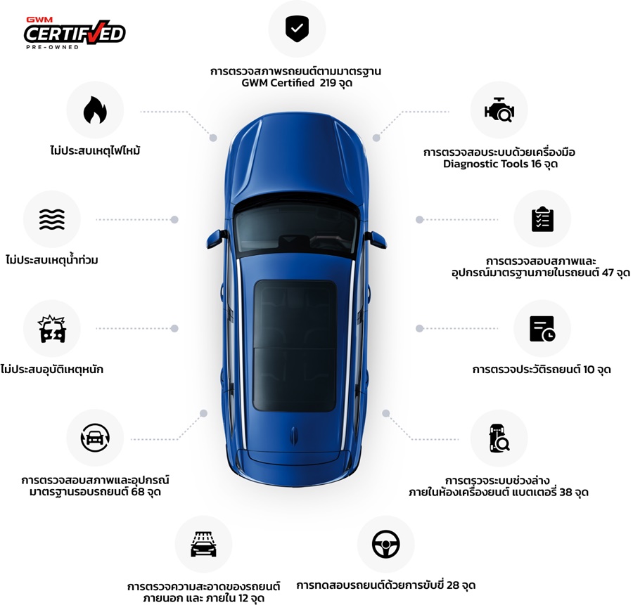 - การตรวจสภาพรถยนต์ตามมาตรฐาน GWM Certified รวมทั้งสิ้น 219 จุด (Best in class)