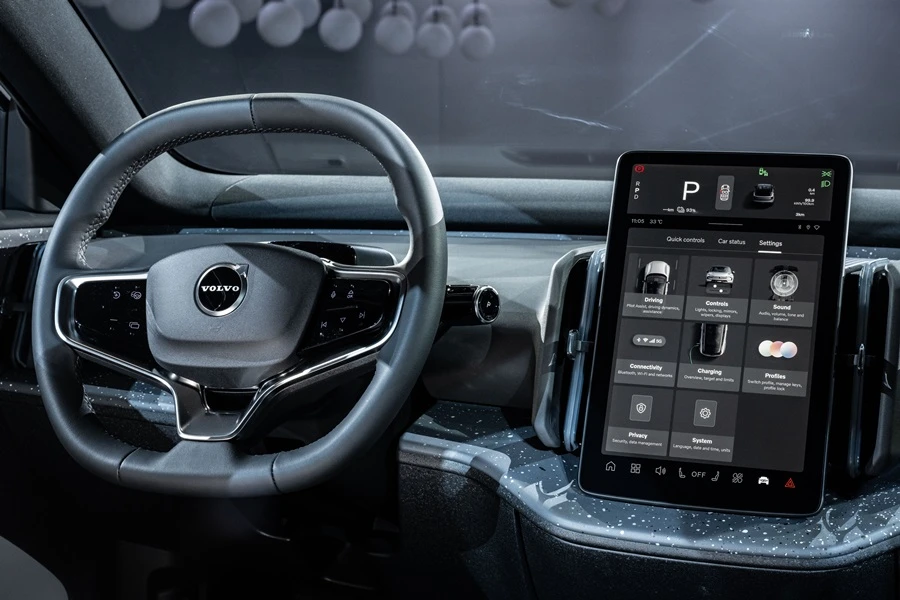 ลักษณะการจัดวางที่เน้นการควบคุมจากศูนย์กลางผ่านจอทัชสกรีนขนาด 12.3 นิ้ว บนแผงแดชบอร์ดรวบรวมฟังก์ชันการควบคุมรถ รวมถึงข้อมูลที่สำคัญสำหรับผู้ขับขี่เพื่อความสะดวกในการใช้งานไว้ในที่เดียว และด้วยการออกแบบที่เน้นการจัดสรรพื้นที่ให้สามารถใช้ประโยชน์ได้อย่างสูงสุด แผงแดชบอร์ดทั้งแผงของ Volvo EX30 จึงถูกติดตั้งชุดลำโพงแบบซาว์ดบาร์จาก Harman Kardon ไว้ภายใน