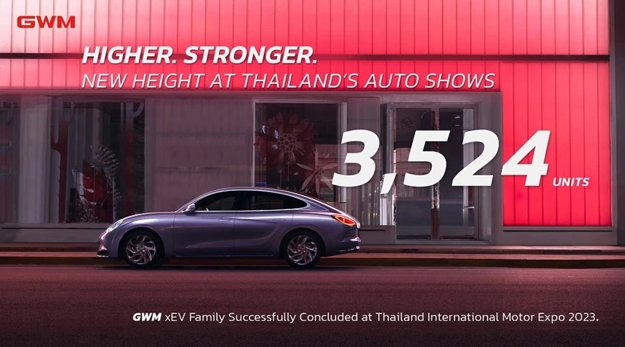 เกรท วอลล์ มอเตอร์ ประกาศความสำเร็จจากงาน มหกรรมยานยนต์ ครั้งที่ 40 หรือ Motor Expo 2023 ด้วยยอดจองรวมกว่า 3,524 คัน ซึ่งเป็นยอดจองที่สูงที่สุดเป็นประวัติการณ์สำหรับงานจัดแสดงรถยนต์ระดับชาติ นับตั้งแต่ที่ เกรท วอลล์ มอเตอร์ ได้เข้ามาดำเนินธุรกิจในประเทศไทย สะท้อนให้เห็นถึงความสามารถในการสร้างสรรค์ยานยนต์คุณภาพที่ได้รับการไว้วางใจจากผู้บริโภคชาวไทยที่เพิ่มขึ้นอย่างต่อเนื่องในทุก ๆ ปี โดยภายในงานยอดจองสูงสุดนำโดย ORA 07 รถยนต์ไฟฟ้า 100% รุ่นใหม่ล่าสุดที่บริษัทฯ ได้ส่งมอบรถยนต์รุ่นนี้ล็อตแรกไปเมื่อวันที่ 10 ธันวาคม 2566 ตามด้วย ORA Good Cat เจ้าเหมียวไฟฟ้าขวัญใจชาวไทยที่มาพร้อมแคมเปญที่ดีที่สุดภายใต้นโยบายการสนับสนุนการใช้รถยนต์ไฟฟ้า 3.0 ของภาครัฐ และ HAVAL JOLION เจ้าสิงโตอารมณ์ดีทั้งรุ่น ULTRA และรุ่น Sport ที่โดดเด่นด้วยเทคโนโลยีอัจฉริยะมากมาย