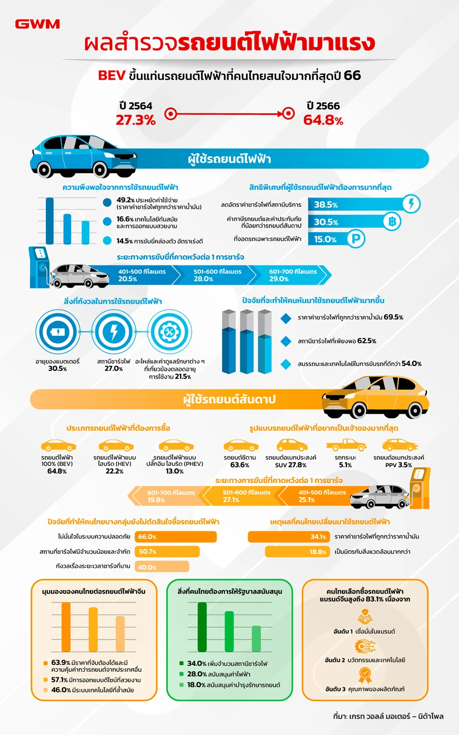 เกรท วอลล์ มอเตอร์ ร่วมกับศูนย์สำรวจความคิดเห็น นิด้าโพล หรือ สถาบันบัณฑิตพัฒนบริหารศาสตร์ สำรวจความคิดเห็นและพฤติกรรมคนไทยที่มีต่อรถยนต์พลังงานไฟฟ้า 1,000 คนทั่วประเทศในเดือนธันวาคม 2566 พบว่า คนไทยให้ความสนใจรถยนต์พลังงานไฟฟ้าแบบแบตเตอรี่ (Battery Electric Vehicle: BEV) มากที่สุดถึง 64.8% ซึ่งเพิ่มขึ้นจากผลสำรวจในปี 2564 อย่างมีนัยสำคัญถึง 37.5% ตามด้วยรถยนต์พลังงานไฟฟ้าแบบไฮบริด (Hybrid Electric Vehicle: HEV) ที่ 22.2% และรถยนต์พลังงานไฟฟ้าแบบปลั๊กอินไฮบริด (Plug-in Hybrid Electric Vehicle: PHEV) ที่ 13.0% โดยผลสำรวจระบุว่า คนไทยพิจารณาราคาค่าชาร์จไฟที่ถูกกว่าราคาน้ำมัน (34.1%) และความเป็นมิตรต่อสิ่งแวดล้อม (18.9%) เป็นปัจจัยหลักที่ส่งผลต่อการตัดสินใจซื้อรถยนต์ไฟฟ้า สะท้อนให้เห็นถึงความสนใจในรถยนต์พลังงานใหม่ของผู้บริโภคชาวไทยที่ให้ความสำคัญกับการขับขี่ที่ใส่ใจต่อสิ่งแวดล้อมมากขึ้น และความคุ้มค่าในด้านค่าใช้จ่ายของการชาร์จรถยนต์ไฟฟ้าเมื่อเทียบกับราคาน้ำมันที่มีแนวโน้มพุ่งขึ้นสูงอย่างต่อเนื่องในปัจจุบัน