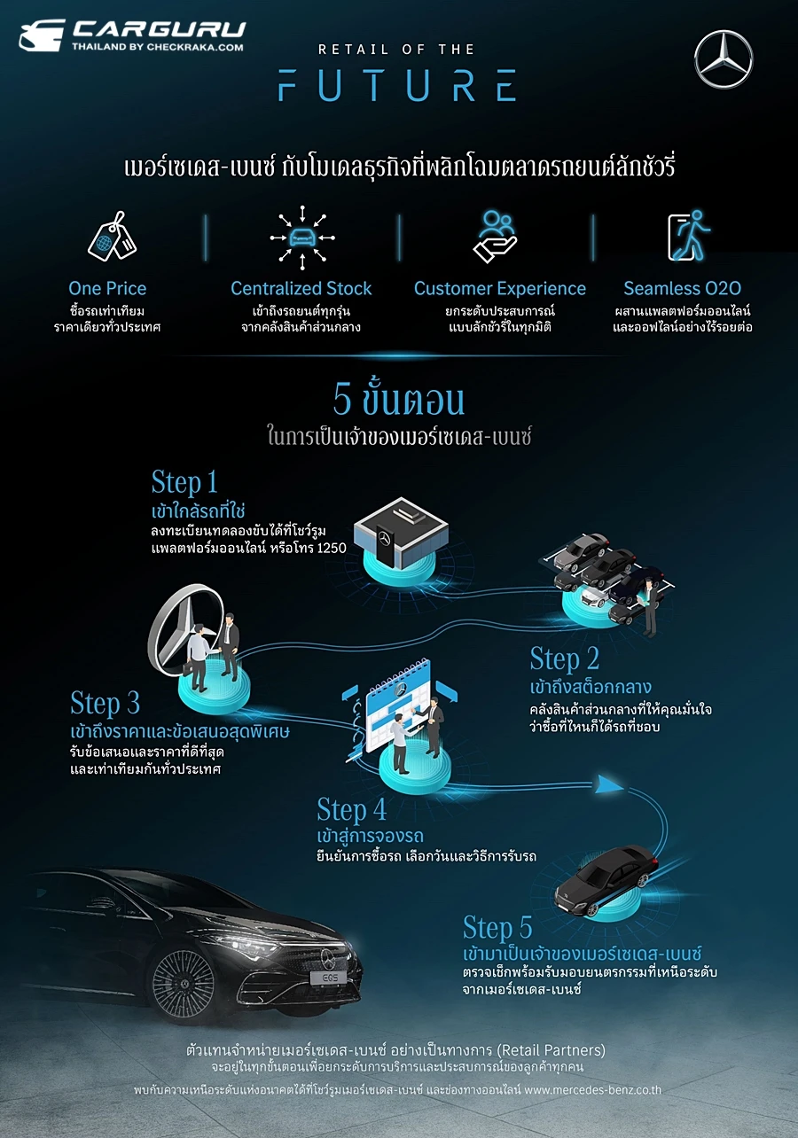 “Retail of the Future” เป็นโมเดลธุรกิจที่มอบข้อได้เปรียบให้กับลูกค้าโดยตรง เน้นเรื่องความโปร่งใสด้านราคาและข้อเสนอที่เท่าเทียมกันในทุกแพลตฟอร์ม รวมไปถึงการที่ลูกค้าสามารถเลือกรถยนต์ทุกรุ่นที่ต้องการผ่านระบบคลังสินค้าส่วนกลางที่เชื่อมต่อกันทั่วประเทศ โดยผสานความโดดเด่นจากโมเดลธุรกิจให้ความสำคัญกับผลประโยชน์ของลูกค้า การเป็นธุรกิจที่ยั่งยืนและจูงใจสำหรับตัวแทนจำหน่ายฯ รวมถึงแคมเปญพิเศษจากทาง "เมอร์เซเดส-เบนซ์ ประเทศไทย"  ในขณะที่สามารถสร้างโอกาสใหม่ ๆ ให้กับแบรนด์ ในการเข้าถึงลูกค้าและกลุ่มเป้าหมายได้เป็นอย่างดี