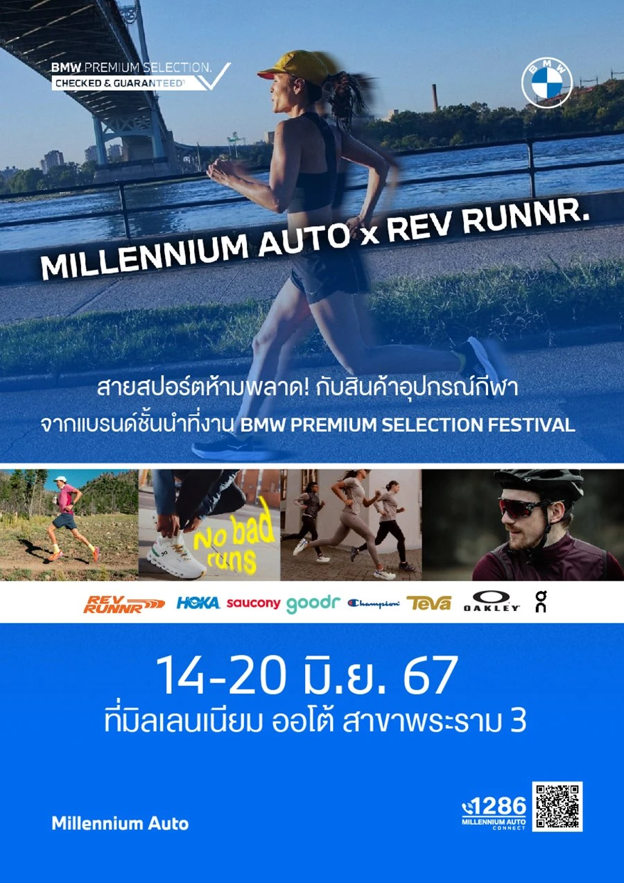 - 14-20 มิถุนายน ครั้งแรกที่ มิลเลนเนียม ออโต้ ร่วมกับ REV RUNNR เอาใจสายสปอร์ต กับอุปกรณ์กีฬา แบรนด์ชั้นนำกว่า 100 รายการ อาทิ On, Hoka, Saucony, Goodr, Champion, Teva, Oakley จาก REV RUNNR ที่ยกขบวนสินค้านำมาให้เลือกช้อปอย่างจุใจ ที่โชว์รูม มิลเลนเนียม ออโต้ พระราม 3 และยังมีสินค้า บีเอ็มดับเบิลยู ไลฟ์สไตล์ และแอคเซสเซอรี ราคาพิเศษ