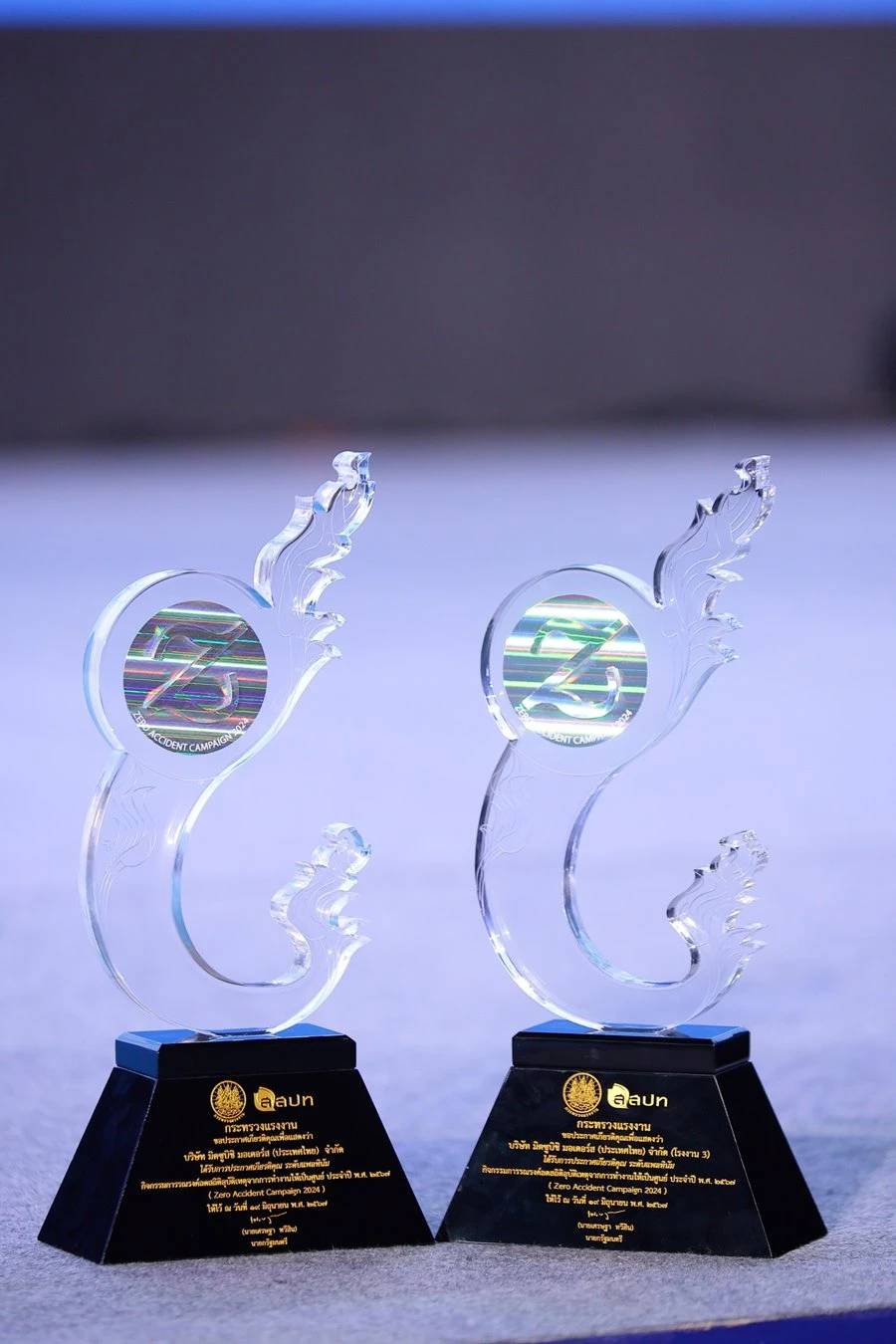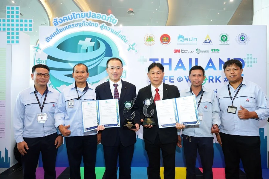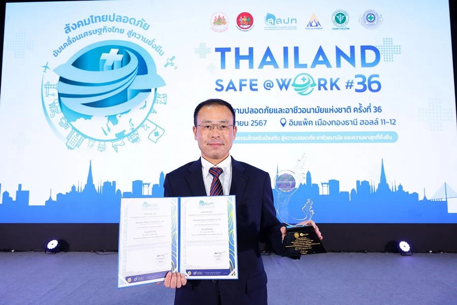 บริษัท มิตซูบิชิ มอเตอร์ส (ประเทศไทย) จำกัด และ บริษัท เอ็มเอ็มทีเอช เอ็นจิ้น จำกัด นำโดย มร. เออิจิ โอกาวะ (ขวา) กรรมการรองผู้จัดการใหญ่ สายงานผลิต บริษัท มิตซูบิชิ มอเตอร์ส (ประเทศไทย) จำกัด และ นายมนัส ยงพฤกษา ผู้ช่วยกรรมการผู้จัดการใหญ่ สายงานผลิต บริษัท มิตซูบิชิ มอเตอร์ส (ประเทศไทย) จำกัด รับรางวัลกิจกรรมรณรงค์ลดสถิติอุบัติเหตุจากการทำงานให้เป็นศูนย์ ประจำปี 2567 (Zero Accident Campaign 2024) จาก นายพิพัฒน์ รัชกิจประการ รัฐมนตรีว่าการกระทรวงแรงงาน ในงานความปลอดภัยและอาชีวอนามัยแห่งชาติ ครั้งที่ 36 ตอกย้ำความมุ่งมั่นอย่างไม่หยุดยั้งที่จะยกระดับความปลอดภัยในการทำงานด้วยการคว้า 5 รางวัลกิจกรรมรณรงค์ลดสถิติอุบัติเหตุจากการทำงานให้เป็นศูนย์ ประจำปี 2567 (Zero Accident Campaign 2024) จากสถาบันส่งเสริมความปลอดภัย อาชีวอนามัย และสภาพแวดล้อมในการทำงาน (องค์การมหาชน) ซึ่งจัดขึ้นภายในงานความปลอดภัยและอาชีวอนามัยแห่งชาติ ครั้งที่ 36 ด้วยการดำเนินงานที่มีมาตรฐานระดับโลก