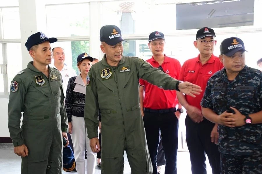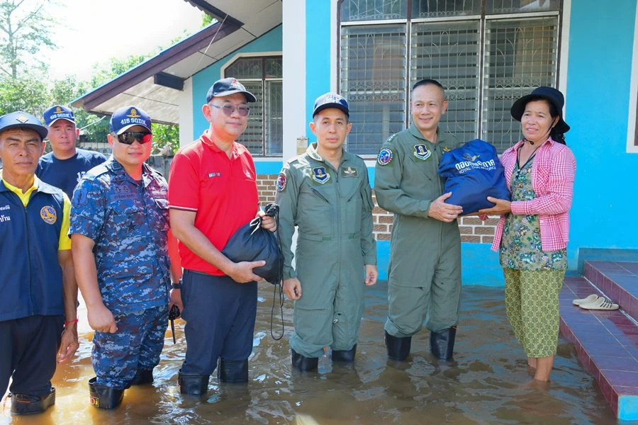 พลอากาศโท ประภาส สอนใจดี (ที่ 3 จากขวา) เจ้ากรมกิจการพลเรือนทหารอากาศ กองทัพอากาศไทย พร้อมด้วย นาวาอากาศเอก เกริกพล สิทธิทูล ผู้อำนวยการกองบรรเทาสาธารณภัย กรมกิจการพลเรือนทหารอากาศ กองทัพอากาศไทย (ที่ 2 จากขวา) รับมอบสิ่งของเครื่องใช้บริจาครวมมูลค่า 100,000 บาท เพื่อช่วยเหลือผู้ประสบอุทกภัย ในจังหวัดเชียงราย จาก บริษัท มิตซูบิชิ มอเตอร์ส (ประเทศไทย) จำกัด นำโดย นายสาโรจน์ มะอาจเลิศ (ที่ 3 จากซ้าย) กรรมการรองผู้จัดการใหญ่ สายงานขายและบริการหลังการขาย และนายธราดล วัฒนะลาภา (ซ้ายสุด) ผู้ชำนาญการอาวุโส พร้อมด้วย ทพญ. สุจินดา นิมิตรรุ่งทวี (ที่ 2 จากซ้าย) รองกรรมการผู้จัดการ บริษัท มิตซูพันล้าน จำกัด และนางสลินดา ชมภูศรี (ขวาสุด) กรรมการผู้จัดการ บริษัท มิตซูล้านนา จำกัด