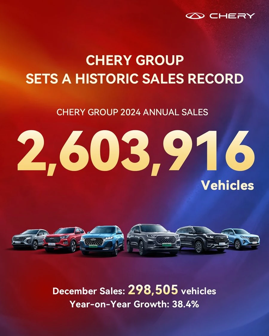 และยังครองตำแหน่งผู้ส่งออกรถยนต์นั่งส่วนบุคคลอันดับหนึ่งของจีนเป็นเวลา 22 ปีติดต่อกัน มียอดขายรถพลังงานใหม่ (NEV) จำนวน 583,569 คัน เพิ่มขึ้น 232.7% ซึ่งในเดือนธันวาคมมียอดขายรถพลังงานใหม่ ทะลุ 100,000 คัน เพิ่มขึ้น 31.9% เมื่อเทียบกับเดือนเดียวกันของปีที่แล้ว ถือเป็นแบรนด์รถยนต์ที่เติบโตที่สุดในกลุ่มผู้ผลิตรถยนต์รายใหญ่ของจีน และในปีที่ผ่านมา Chery Automobile ยังคว้าตำแหน่งแบรนด์ในประเทศที่มีอันดับสูงสุดอีกครั้งในรายงาน China Initial Quality Study (IQS) ประจำปี 2024 ของ J.D. Power ด้วยการควบคุมคุณภาพอย่างเข้มงวด Chery Automobile จึงสามารถเพิ่มขีดความสามารถในการแข่งขันในตลาดได้อย่างต่อเนื่อง และกำหนดมาตรฐานใหม่สำหรับรถยนต์ Made in China