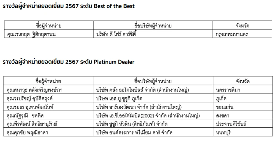 นอกจากการประกาศวิสัยทัศน์ในการดำเนินธุรกิจแล้ว ยังได้มีการจัดพิธีมอบรางวัลให้แก่ผู้ชนะในการแข่งขัน SUZUKI Best Dealer Award 2024 ซึ่งเป็นหนึ่งในแผนพัฒนางานบริการของผู้จำหน่าย ผ่านการจัดการแข่งขันผู้จำหน่ายยอดเยี่ยม ซึ่งจัดมาต่อเนื่องเป็นปีที่ 7 มุ่งหวังจะยกระดับมาตรฐานการดำเนินงานในทุกด้าน โดยมีรายชื่อผู้ได้รับรางวัล ดังนี้