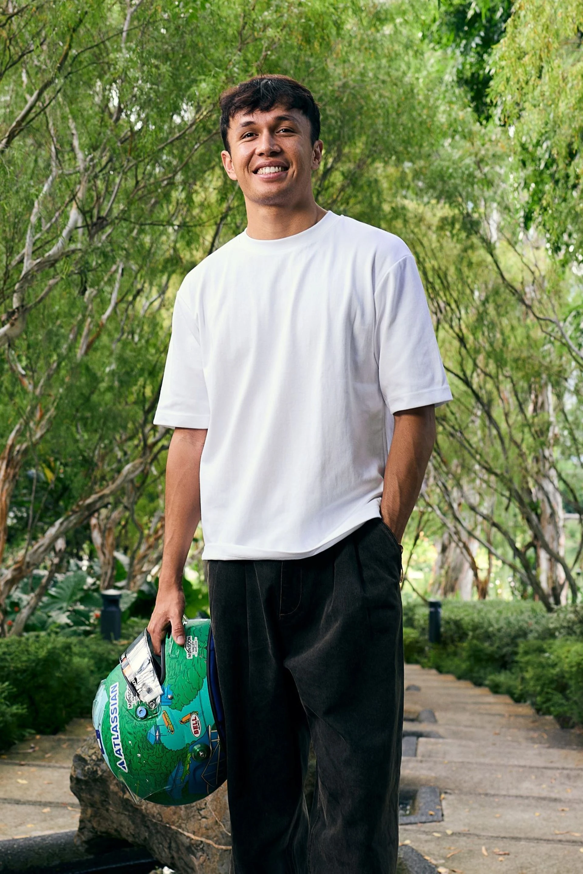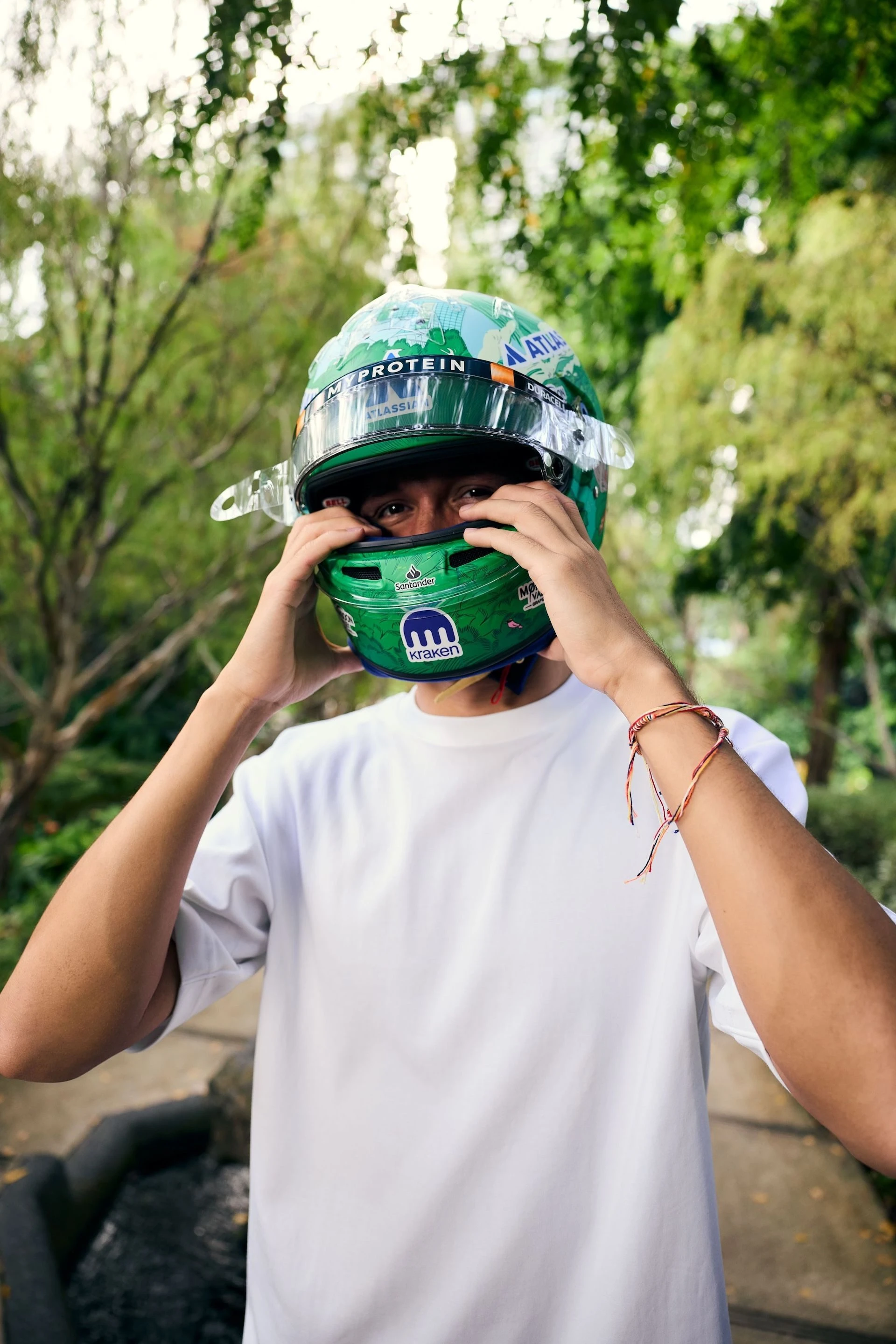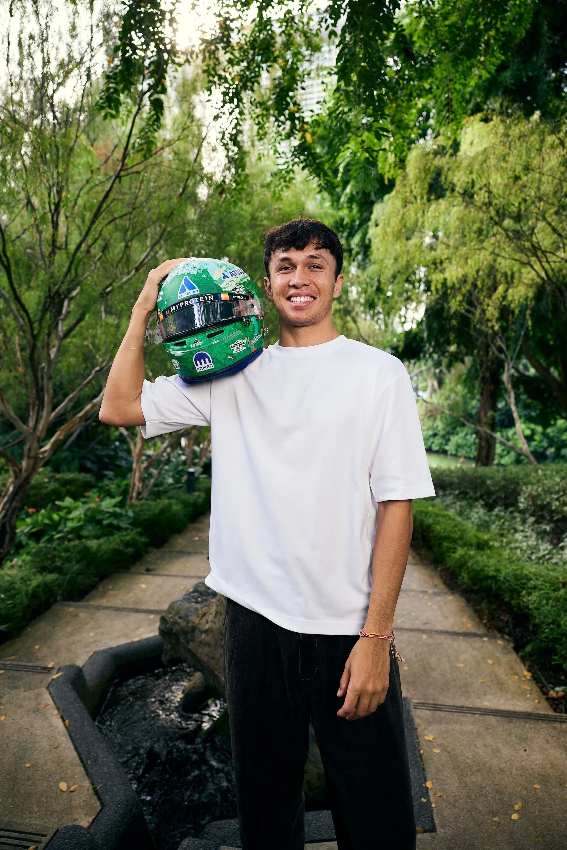 คาร์ลอตตา เฟรเออร์ (Karlotta Freier) ถ่ายทอดแรงบันดาลใจจากลวดลายไทยและเอเชียที่สะท้อนถึงภูมิลำเนาของอัลบอนในเอเชียตะวันออกเฉียงใต้ โดยเขาจะสวมใส่หมวกใบดังกล่าวลงแข่งขันในรายการ สิงคโปร์กรังด์ปรีซ์ ระหว่างวันที่ 3–5 ตุลาคม 2568