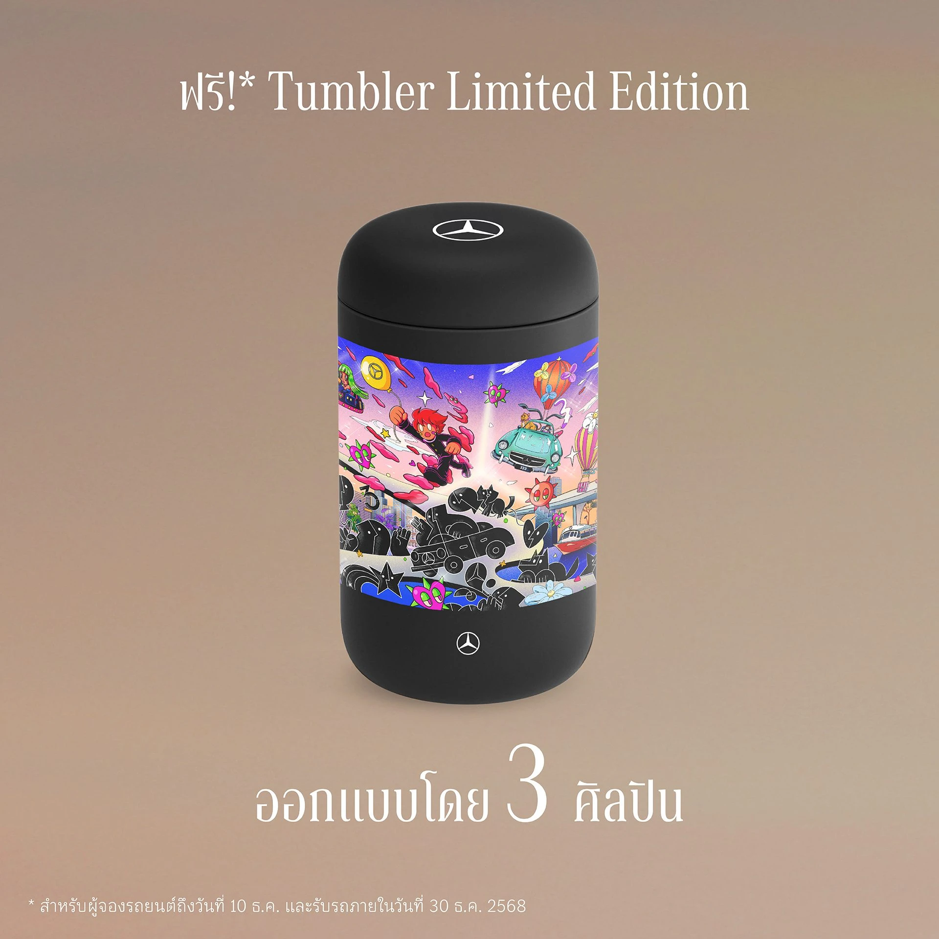 ที่นี่ และสำหรับลูกค้าที่จองรถยนต์เมอร์เซเดส-เบนซ์ ทุกรุ่น ในงาน จะได้รับกล้อง Mercedes-Benz Drive Recorder 360° มูลค่า 16,500 บาท* และของสมนาคุณสุดพิเศษ Tumbler Limited Edition ที่ออกแบบโดยศิลปินรุ่นใหม่ทั้ง 3 ท่าน ได้แก่ Jeff Aphisit, Bomfha และ MR.HALFMAN
