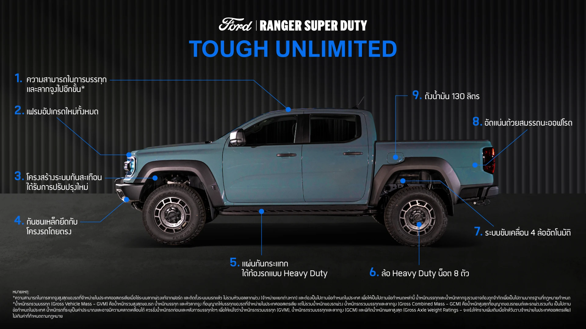 2 ความสามารถในการลากจูงสูงสุดของรถที่จำหน่ายในประเทศออสเตรเลียเมื่อใช้ระบบลากพ่วงแท้จากฟอร์ด และติดตั้งระบบเบรกแล้ว ไม่รวมหัวบอลลากพ่วง (จำหน่ายแยกต่างหาก) และต้องเป็นไปตามข้อกำหนดในประเทศ เพื่อให้เป็นไปตามข้อกำหนดเหล่านี้ น้ำหนักบรรทุกและน้ำหนักลากจูงรวม อาจต้องถูกจำกัดเพื่อเป็นไปตามมาตรฐานที่กฎหมายกำหนด น้ำหนักรถรวมบรรทุก (Gross Vehicle Mass - GVM) คือน้ำหนักรวมสูงสุดของรถ น้ำหนักบรรทุก และหัวลากจูง ที่อนุญาตให้บรรทุกของรถที่จำหน่ายในประเทศออสเตรเลีย แต่ไม่รวมน้ำหนักของรถพ่วง น้ำหนักรถรวมบรรทุกและลากจูง (Gross Combined Mass - GCM) คือน้ำหนักสูงสุดที่อนุญาตของรถยนต์และรถพ่วงรวมกัน เป็นไปตามข้อกำหนดในประเทศ น้ำหนักรถที่ระบุเป็นค่าประมาณและอาจมีความคลาดเคลื่อนได้ ควรชั่งน้ำหนักรถก่อนและหลังการบรรทุกใดๆ เพื่อให้แน่ใจว่าน้ำหนักรถรวมบรรทุก (GVM), น้ำหนักรถรวมบรรทุกและลากจูง (GCM) และพิกัดน้ำหนักเพลาสูงสุด (Gross Axle Weight Ratings - จะแจ้งให้ทราบเพิ่มเติมเมื่อใกล้วันวางจำหน่ายในประเทศไทย ไม่เกินค่าที่กำหนดตามกฎหมาย