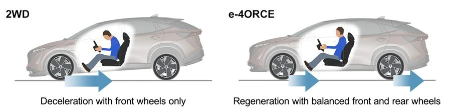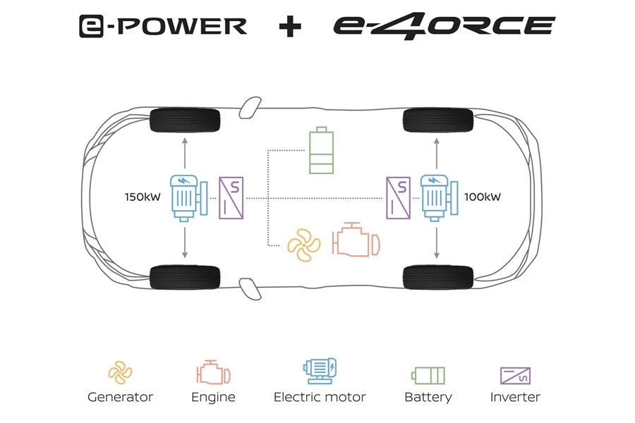 นิสสันได้อธิบายว่า e มาจากระบบขับเคลื่อนด้วยมอเตอร์ไฟฟ้า 100% ส่วน 4ORCE ที่ออกเสียงว่า ฟอร์ซ สื่อถึงพละกำลังของรถ โดยที่ 4 หมายถึงระบบขับเคลื่อนสี่ล้อ ในการพัฒนา อี-ฟอร์ซ นิสสัน ได้รวมเอา 3 เทคโนโลยีขั้นสูงที่เกี่ยวข้องกับการขับเคลื่อน การทรงตัวมารวมไว้ด้วยกัน คือ อี-พาวเวอร์ ระบบขับเคลื่อนด้วยมอเตอร์ไฟฟ้า ที่ให้ความเงียบ แต่เต็มไปด้วยพละกำลังที่สามารถตอบสนองอย่างทันใจ ระบบขับเคลื่อนสี่ล้อ AWD ที่แม่นยำ มีการกระจายกำลังไปแต่ละล้อได้อย่างสมดุล และระบบควบคุมการทำงานของแชสซี ที่ทำให้การทรงตัวของรถมีเสถียรภาพมากขึ้น นั่งสบายจนรู้สึกได้อย่างชัดเจน ผลลัพธ์ที่ได้ คือ ประสบการณ์ใหม่ในการขับขี่ที่น่าประทับใจกับการตอบสนองที่ฉับไว การทรงตัวที่ดีเยี่ยม และให้ความมั่นใจอย่างเต็มเปี่ยมไม่ว่าจะขับขี่บนพื้นผิวแบบใดก็ตาม