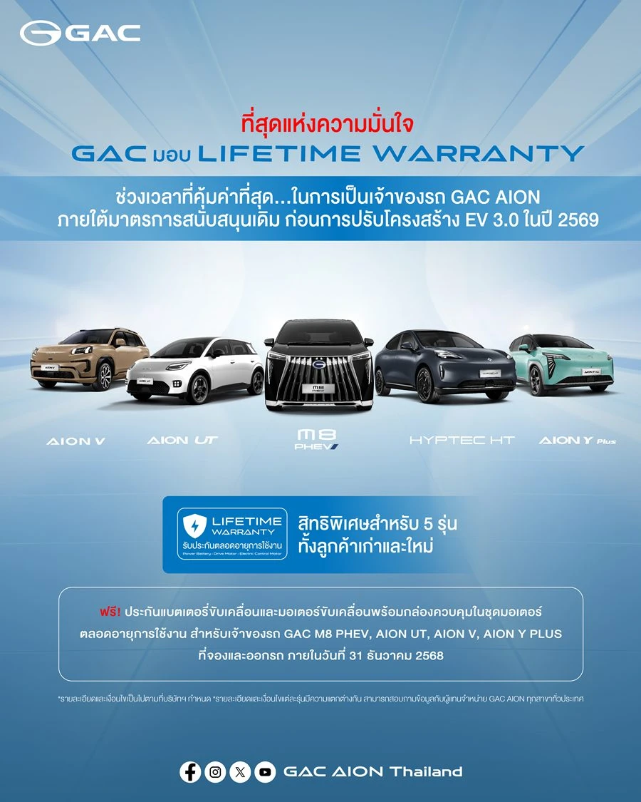 เพื่อเป็นการตอบแทนความไว้วางใจที่ลูกค้าชาวไทยมอบให้เสมอมา GAC AION Thailand ได้ประกาศยกระดับมาตรฐานการดูแลครั้งสำคัญ ด้วยการมอบสิทธิ์การรับประกันแบตเตอรี่ขับเคลื่อนและมอเตอร์ขับเคลื่อนพร้อมกล่องควบคุมในชุดมอเตอร์ตลอดอายุการใช้งาน (Lifetime Warranty) ให้ครอบคลุมรถยนต์ GAC AION ครบทุกรุ่น ได้แก่ GAC HYPTEC HT, GAC M8 PHEV, GAC AION V, GAC AION UT และ GAC AION Y Plus โดยสิทธิพิเศษนี้มอบให้ทั้งลูกค้าใหม่และลูกค้าปัจจุบัน ที่จองและออกรถภายในวันที่ 31 ธันวาคม 2568 เพื่อยืนยันถึงความตั้งใจจริงที่จะดูแลสมาชิกครอบครัว GAC AION ทุกท่านเสมือนคนในครอบครัว และสร้างความมั่นใจในการใช้งานระยะยาวอย่างแท้จริง
