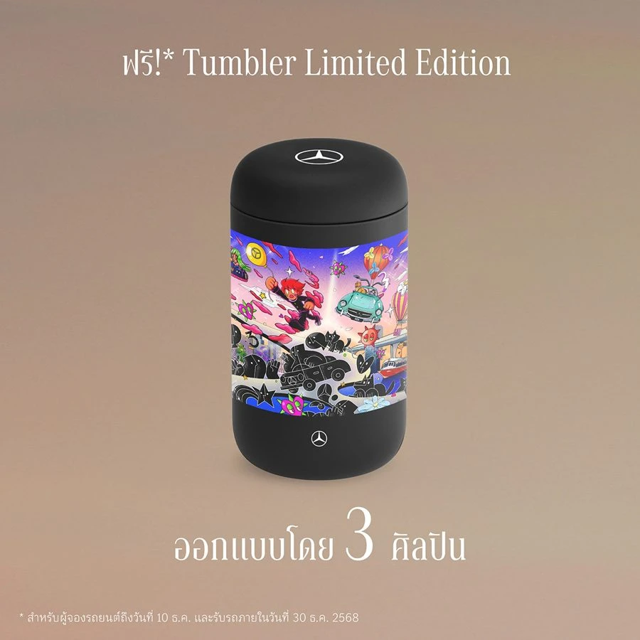 และสำหรับลูกค้าที่จองรถยนต์เมอร์เซเดส-เบนซ์ ในงาน*** จะได้รับกล้อง Mercedes-Benz Drive Recorder 360° มูลค่า 16,500 บาท* และของสมนาคุณสุดพิเศษ Tumbler Limited Edition ที่ออกแบบโดยศิลปินรุ่นใหม่ทั้ง 3 ท่าน ได้แก่ Jeff Aphisit, Bomfha และ MR.HALFMAN