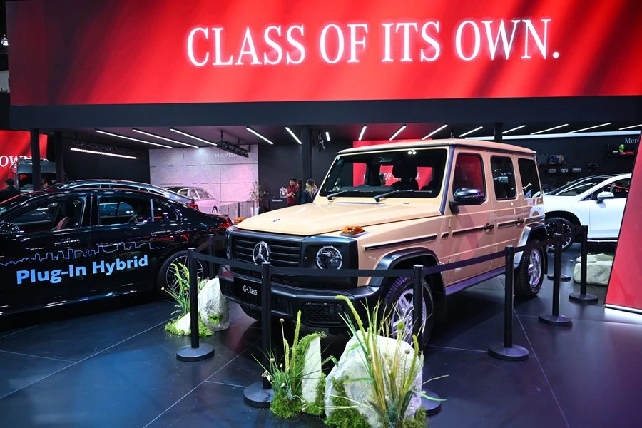 ภายในบูธเมอร์เซเดส-เบนซ์ ลูกค้าทุกคนจะได้พบกับยนตรกรรมใหม่ล่าสุดอีก 3 รุ่น ที่นำมาจัดแสดงเป็นครั้งแรกในประเทศไทย เริ่มด้วย The new CLA รถยนต์พลังงานไฟฟ้า 100% รุ่นแรกที่มาพร้อมแพลตฟอร์ม MMA (Mercedes-Benz Modular Architecture) และแบตเตอรี่ 800V ขนาด 85 kWh ซึ่งมอบระยะทางการขับขี่ด้วยพลังงานไฟฟ้าสูงสุดถึง 792 กิโลเมตร ต่อการชาร์จเต็มหนึ่งครั้ง ตามมาตรฐาน WLTP โดยจะมีการเปิดตัวอย่างเป็นทางการพร้อมประกาศราคาจำหน่าย ในช่วงต้นปี 2569 ตามด้วย G 450 d Edition STRONGER THAN THE 1980s โมเดลพิเศษที่พัฒนาขึ้นโดยมีแรงบันดาลใจมาจาก W460 ในยุค 80 นำเข้ามาในประเทศไทยจำนวน 3 คัน จาก 460 คันทั่วโลก วางจำหน่ายในราคา 14,180,000 บาท
