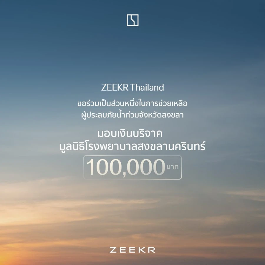 นายอเล็กซ์ เป่า กรรมการผู้จัดการภูมิภาคเอเชียตะวันออกเฉียงใต้ บริษัท ซีเคอาร์ อินเทลลิเจนท์ เทคโนโลยี (ประเทศไทย) จำกัด หรือ ZEEKR Thailand มอบเงินช่วยเหลือผู้ประสบอุทกภัยภาคใต้ ผ่าน มูลนิธิโรงพยาบาลสงขลานครินทร์ จำนวน 100,000 บาท และมูลนิธิองค์กรทำดี จำนวน 100,000 บาท โดยมี ดร.ปนัดดา วงศ์ผู้ดี ประธานมูลนิธิองค์กรทำดี เป็นผู้รับมอบ