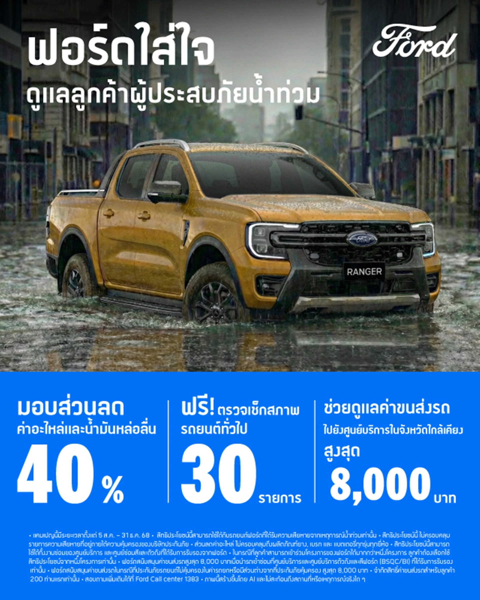แคมเปญช่วยเหลือลูกค้าฟอร์ดที่ได้รับผลกระทบจากอุทกภัยในพื้นที่ภาคใต้ ประกอบด้วย บริการตรวจสภาพทั่วไปฟรี 30 รายการ ส่วนลดค่าอะไหล่และน้ำมันหล่อลื่น 40% โดยส่วนลดค่าอะไหล่ ไม่ครอบคลุมผลิตภัณฑ์ยาง เบรก แบตเตอรี่ทุกรุ่นทุกยี่ห้อ รวมถึงความเสียหายที่อยู่ภายใต้ความคุ้มครองของบริษัทประกันภัย นอกจากนี้ เพื่อเร่งบรรเทาให้ลูกค้าได้รับรถกลับไปใช้งานในสภาพปกติได้อย่างรวดเร็วยิ่งขึ้น ฟอร์ดยังทำงานร่วมกับเครือข่ายศูนย์บริการฟอร์ดในพื้นที่ใกล้เคียงในการสนับสนุนค่าใช้จ่ายเกี่ยวกับการขนส่งรถของลูกค้าที่ได้รับผลกระทบ ที่วงเงินไม่เกิน 8,000 บาท2 ซึ่งจะพิจารณาการใช้สิทธิ์ตามลำดับความคุ้มครองของประกันภัย และส่วนต่างค่ารถยกที่เกินจากวงเงินประกัน โดยเป็นการยกรถไปยังศูนย์บริการฟอร์ดหรือศูนย์ซ่อมตัวถังและสีมาตรฐานฟอร์ด จำนวน 1 ครั้ง (สงวนสิทธิ์สำหรับลูกค้า 200 รายแรก) ทั้งนี้ ลูกค้ารถฟอร์ดที่ได้รับผลกระทบจากอุทกภัยน้ำท่วมภาคใต้ สอบถามรายละเอียดเพิ่มเติมได้ที่ศูนย์บริการฟอร์ดใกล้เคียง หรือ ศูนย์บริการข้อมูลลูกค้าสัมพันธ์ฟอร์ด Ford Call Center โทร. 1383