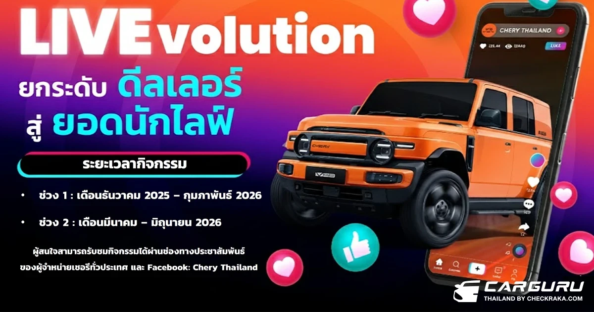 Chery LIVEvolution นับเป็นอีกก้าวสำคัญในการยกระดับและพัฒนาศักยภาพเครือข่ายผู้จำหน่ายให้พร้อมรับการเปลี่ยนแปลงของตลาดยุคดิจิทัล และยกระดับประสบการณ์การสื่อสารกับลูกค้าให้ทันสมัยมากยิ่งขึ้น กิจกรรมแบ่งการจัดออกเป็น 2 ช่วง ได้แก่ เดือนธันวาคม 2025 – กุมภาพันธ์ 2026 และเดือนมีนาคม – มิถุนายน 2026 ผู้สนใจสามารถรับชมกิจกรรมได้ผ่านช่องทางประชาสัมพันธ์ของผู้จำหน่ายเชอรีทั่วประเทศ และ Facebook: Chery Thailand