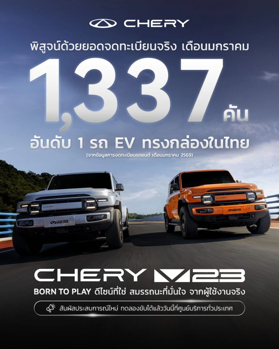 เชอรี ประเทศไทย สร้างปรากฏการณ์ความสำเร็จตั้งแต่ต้นปี 2569 ด้วยกระแสตอบรับที่ร้อนแรงจากผู้บริโภคชาวไทย หลังรถยนต์ เชอรี รุ่น V23 มียอดจดทะเบียนในประเทศไทยมากกว่า 1,337 คัน ภายในเดือนมกราคม 2569 ตอกย้ำถึงความนิยมและความเชื่อมั่นที่ผู้บริโภคมีต่อรถยนต์เชอรีในตลาดประเทศไทยอย่างชัดเจน ความสำเร็จดังกล่าวส่งให้รถยนต์เชอรี รุ่น V23 ติดอันดับ 1 รถยนต์ไฟฟ้าทรงกล่องด้วยยอดจดทะเบียนสูงสุดในประเทศไทยอย่างต่อเนื่องเป็นเดือนที่ 2 ตอกย้ำความโดดเด่นของผลิตภัณฑ์ ทั้งด้านเทคโนโลยีขั้นสูง ความเป็นเลิศด้านความปลอดภัยที่ได้รับการรับรองมาตรฐานความปลอดภัยระดับ 5 ดาวจาก ASIAN NCAP รวมถึงการออกแบบที่มีสไตล์แตกต่าง สามารถตอบสนองตัวตนและไลฟ์สไตล์ของผู้ใช้งานได้อย่างลงตัว