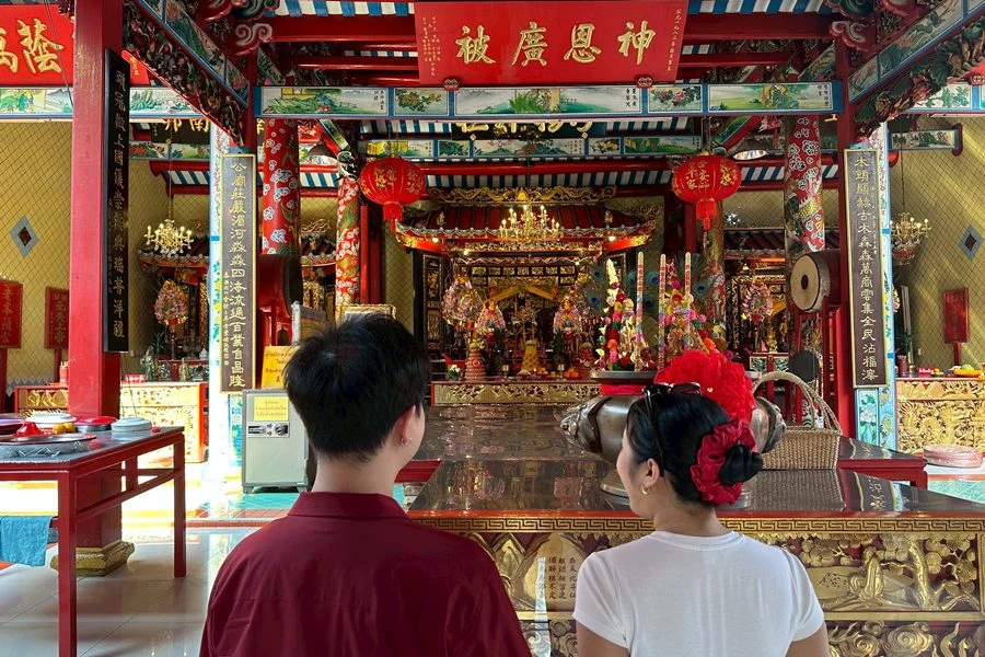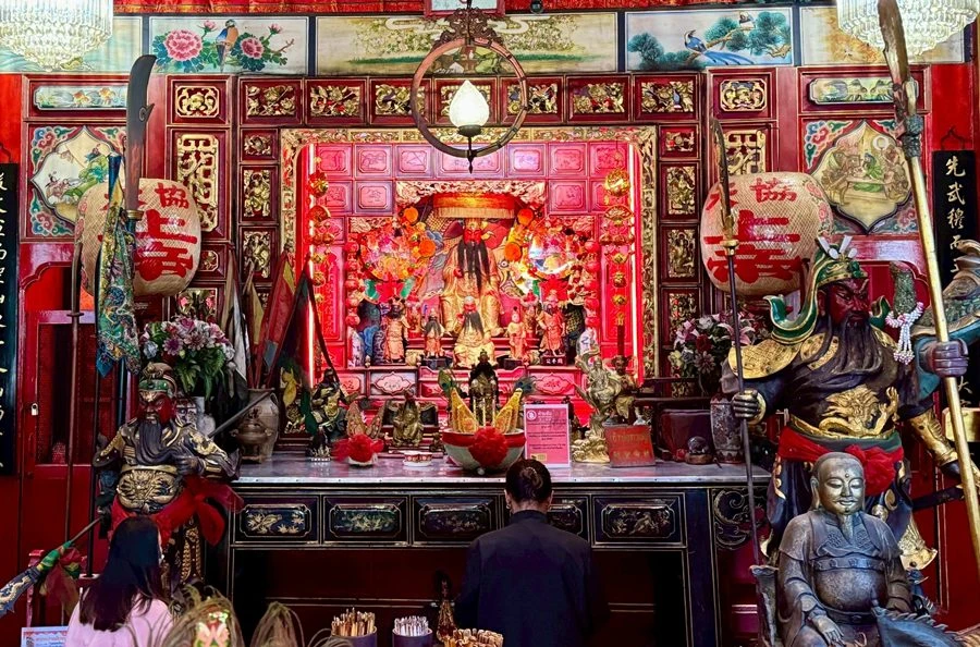 จากนั้นเดินทางต่อสู่ ศาลเจ้ากวนอู ย่านคลองสานที่กำลังเป็นกระแสด้วยการขับเคลื่อนของร้านเก๋ ร้านดัง ทั้งร้านอาหาร คาเฟ่ ร้านจำหน่ายของที่ระลึกมากมาย โดยศาลเจ้าเก่าแก่ที่ก่อตั้งมาตั้งแต่สมัยกรุงศรีอยุธยาตอนปลาย และได้รับการยอมรับว่าเป็นศาลเจ้ากวนอูที่เก่าแก่ที่สุดในประเทศไทย กว่า 290 ปี เทพกวนอู หรือ “อากง” ของชุมชน เป็นสัญลักษณ์แห่งคุณธรรม ความซื่อสัตย์ และความสำเร็จด้านการค้า ผู้ศรัทธานิยมไหว้ขอพรด้านการงาน การค้าขาย เงินทอง และความก้าวหน้าในชีวิต สำหรับการสักการะตามแนวปฏิบัติที่ใช้ ธูป 11 ดอก และเทียน 1 คู่ โดยเริ่มกราบไหว้ เทวดาฟ้าดิน ด้วยธูป 5 ดอก จากนั้นไหว้องค์เทพกวนอู ด้วยธูป 3 ดอก และไหว้พระโพธิสัตว์กวนอิม ด้วยธูปอีก 3 ดอก ก่อนปิดท้ายด้วยพิธี จับเท้าขอพรเทพกวนอู ซึ่งเป็นเอกลักษณ์ของศาลเจ้าแห่งนี้ ซึ่งศักดิ์สิทธิ์ทั้งด้านการงาน การเงิน การเรียน รวมถึงเรื่องการซื้อขายที่ดิน ทั้งนี้ เส้นทางเข้าสู่ศาลเจ้าต้องลัดเลาะผ่านชุมชนวัดอนงค์ ใกล้สวนสมเด็จพระศรีนครินทร์ริมแม่น้ำเจ้าพระยา ช่วยถ่ายทอดบรรยากาศของชุมชนดั้งเดิมที่อบอวลด้วยความศรัทธา และเติมความอิ่มใจให้กับทริปตรุษจีนตลอดการเดินทาง