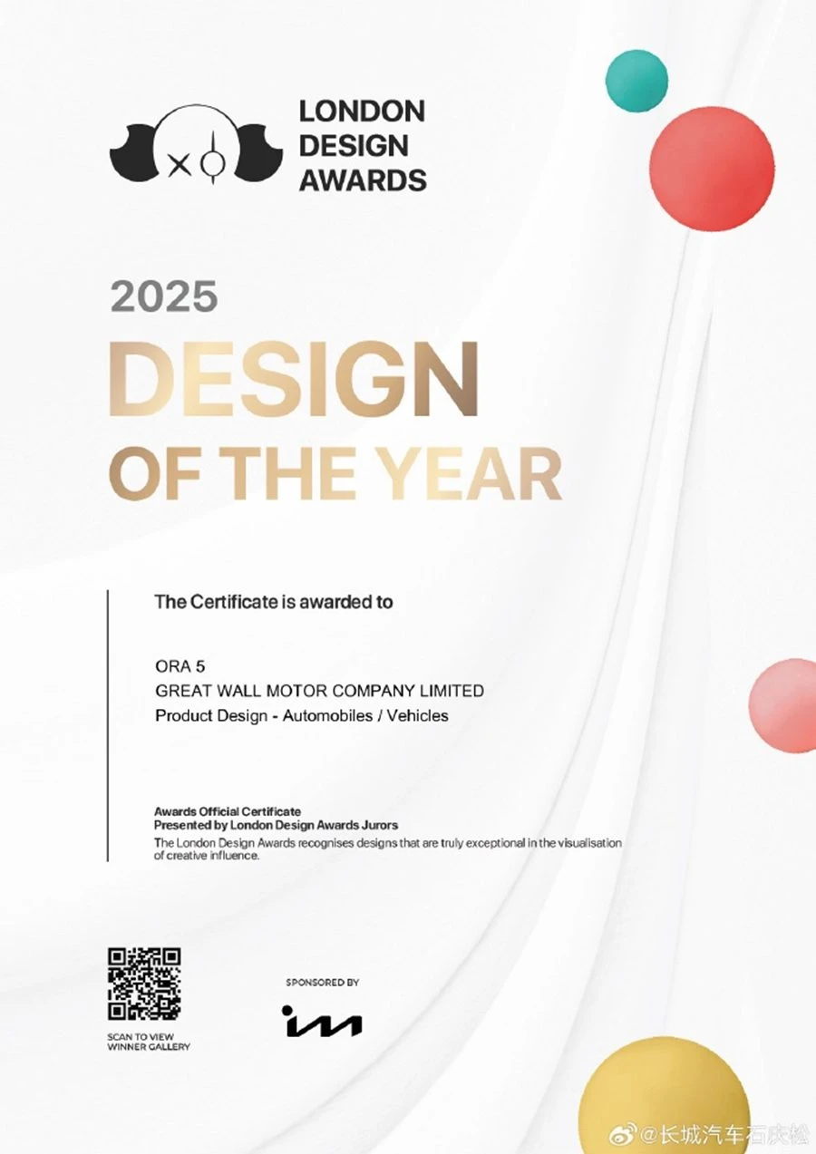 ความสำเร็จบนเวทีการออกแบบระดับนานาชาติครั้งนี้ ที่ GWM ORA 5 ก้าวขึ้นเป็นรถยนต์รุ่นแรกของโลกที่ได้รับการผลิตจริงและสามารถคว้ารางวัลสูงสุดดังกล่าว ตอกย้ำให้เห็นถึงความโดดเด่นของ ORA 5 ในฐานะรถยนต์ที่ได้รับการพัฒนาภายใต้แนวคิดการออกแบบที่ผสานความงามจากธรรมชาติเข้ากับนวัตกรรมสมัยใหม่อย่างลงตัว ไม่เพียงสร้างเอกลักษณ์ที่แตกต่าง แต่ยังยกระดับมาตรฐานการออกแบบยนตรกรรมให้ตอบโจทย์ทั้งด้านสุนทรียศาสตร์และการใช้งานในชีวิตประจำวัน สะท้อนถึงวิสัยทัศน์และศักยภาพของ GWM ในการสร้างสรรค์ยนตรกรรมที่ได้รับการยอมรับในระดับโลก พร้อมเปิดโอกาสให้ผู้สนใจชาวไทยได้ร่วมสัมผัสดีไซน์อันโดดเด่นของ GWM ORA 5 อย่างใกล้ชิด และเตรียมพบกับการเปิดตัวอย่างเป็นทางการในประเทศไทยได้ภายในเดือนมีนาคมนี้