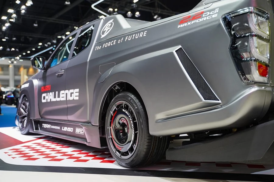 Isuzu Challenge Thailand 2026 Racing Car (Isuzu D-Max Spacecab 2.2 Ddi MAXFORCE) สุดยอดรถแข่งต้นแบบที่ต่อยอด DNA ด้านมอเตอร์สปอร์ตของแบรนด์ ISUZU ซึ่งมุ่งเน้นการสร้างแพลตฟอร์มที่ตอบโจทย์ทั้งสมรรถนะและภาพลักษณ์ที่ยกระดับไปอีกขั้น โดยพัฒนาขึ้นเพื่อสู้ศึกรายการ “ISUZU CHALLENGE THAILAND 2026” โดยเฉพาะ สร้างสรรค์บนพื้นฐานรุ่น Isuzu D-Max Spacecab ยกระดับความเร้าใจด้วยการปรับจูนขุมพลัง 2.2 Ddi MAXFORCE ให้กำลังสูงสุด 285 แรงม้า แรงบิดสูงสุด 507 นิวตัน-เมตร ส่งกำลังผ่านชุดคลัตช์ BK Racing และเฟืองท้ายหลังแบบ Limited Slip ทรงตัวเข้าโค้งเฉียบคมด้วยชุดช่วงล่าง Penske แบบ 2 Way พร้อมชุดแหนบพิเศษ สยบทุกความแรงด้วยระบบเบรก Neotech EVO-R เบรกหน้าขนาด 6 พอร์ต จานเบรก 360 มม. และเบรกหลัง 4 พอร์ต พร้อมผ้าเบรก Ferodo เกาะถนนมั่นใจด้วยล้อฟอร์จขนาด 18 นิ้ว (ล้อหลังติดตั้งแผ่น Aerodisc) รัดด้วยยาง Toyo Tires รุ่น Proxes Sport 2 ขนาด 275/40 R18 ซึ่งเป็นยาง Isuzu Challenge Official Tires