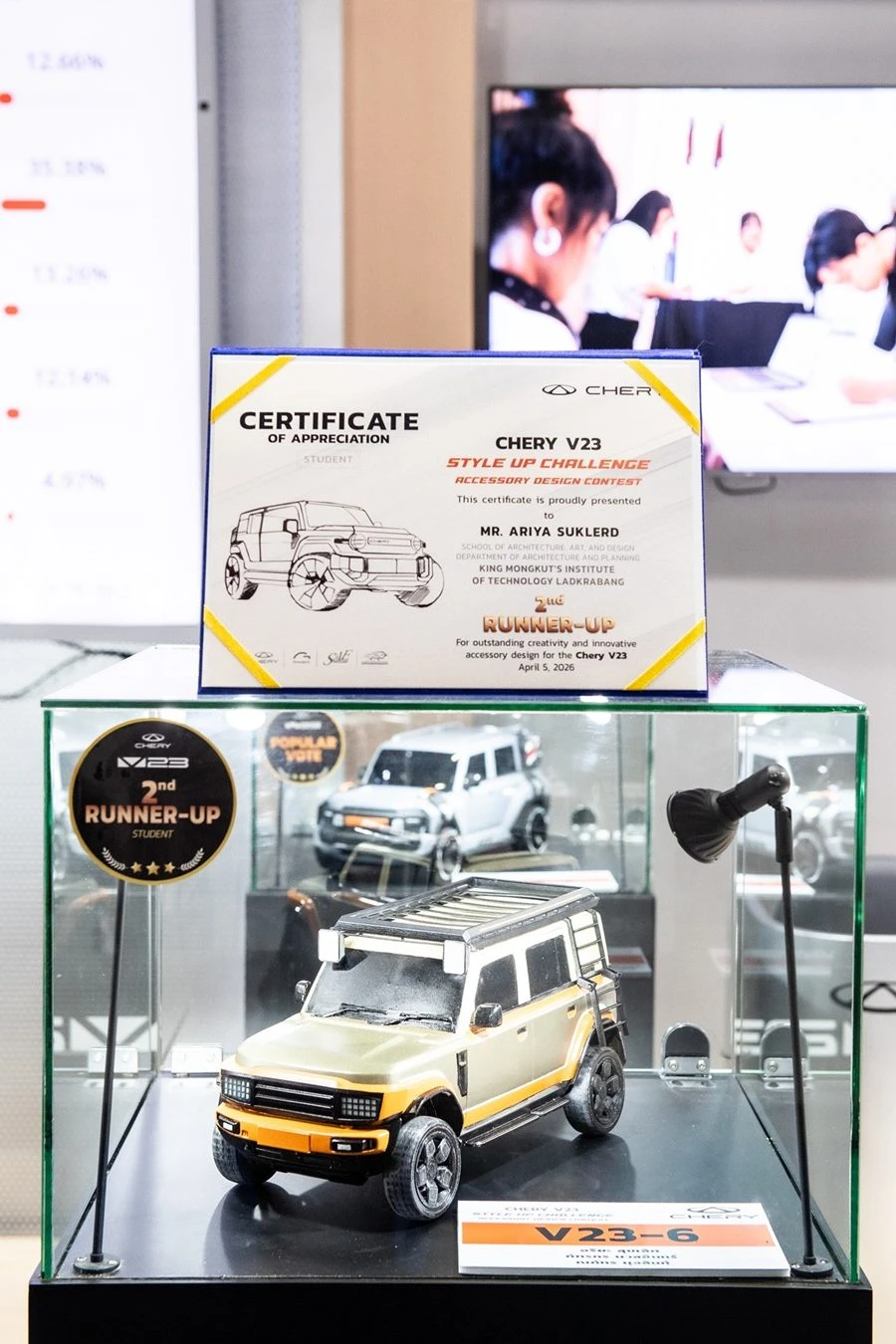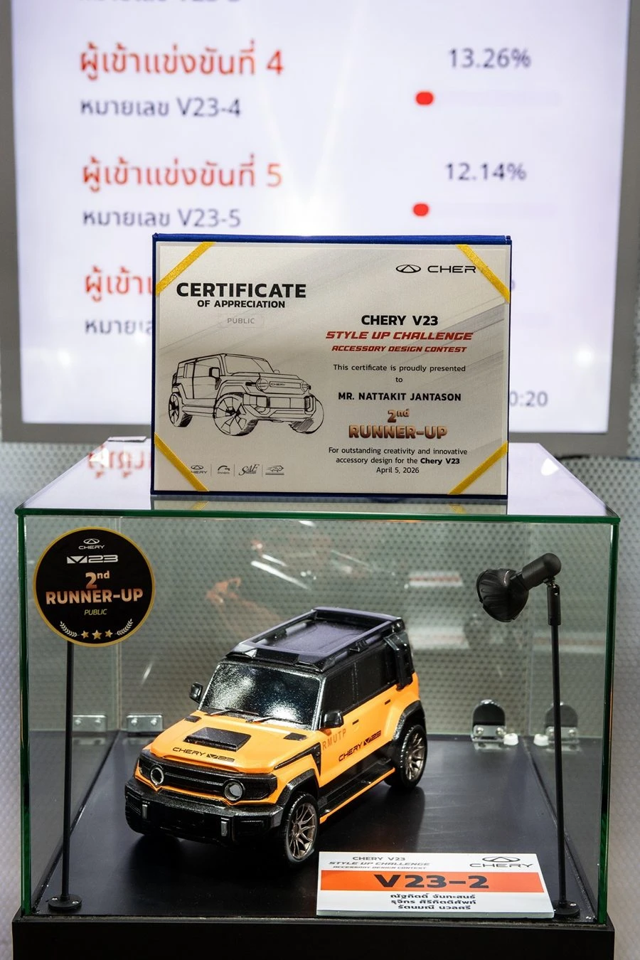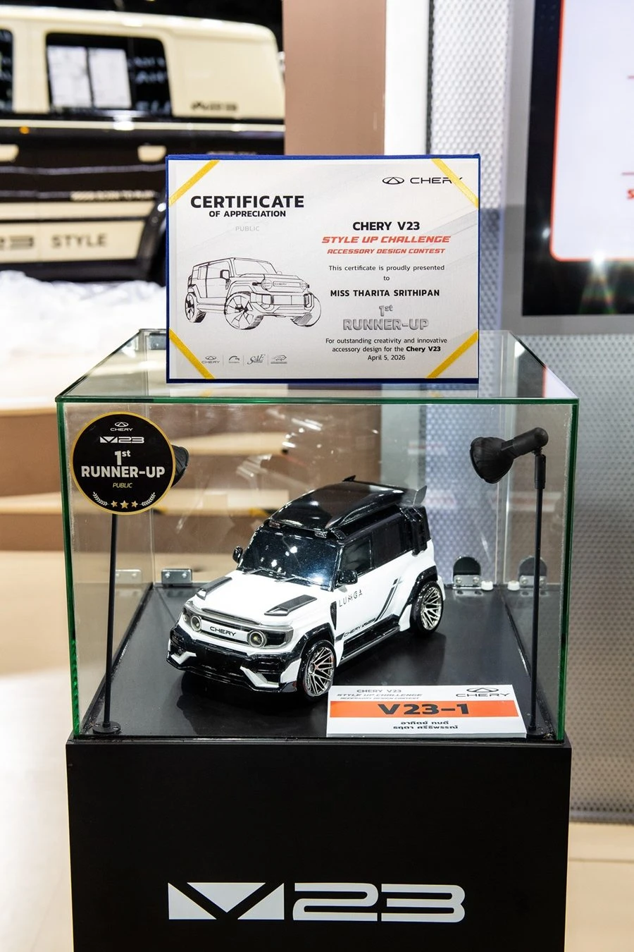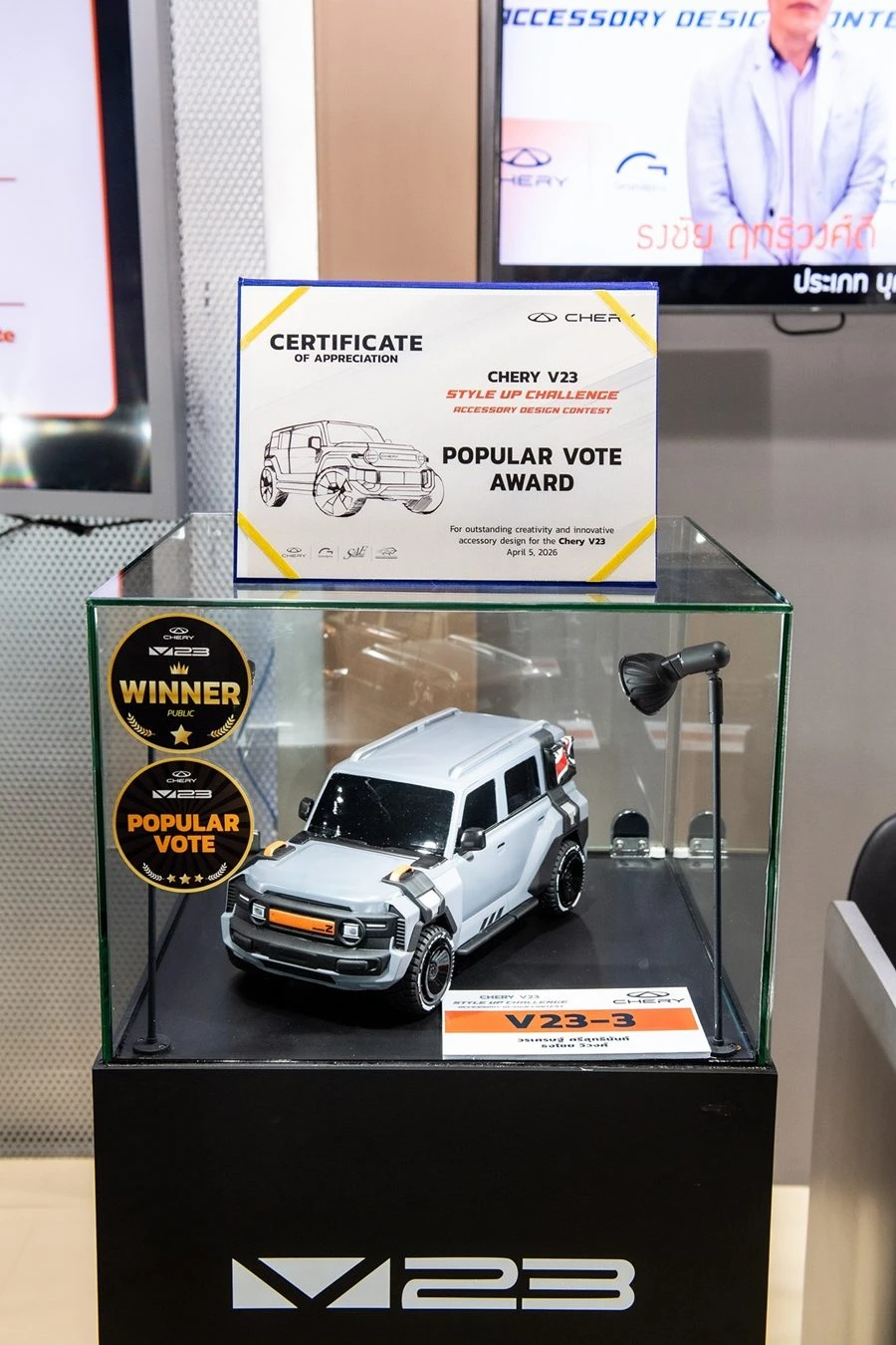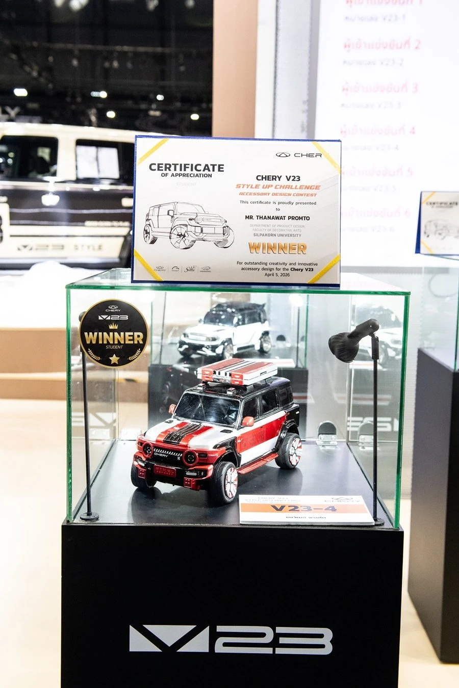 เชอรี ประเทศไทย ร่วมกับ สมาคมวิศวกรรมยานยนต์ไทย, บริษัท กรังด์ปรีซ์ อินเตอร์เนชั่นแนล จำกัด (มหาชน) และสมาคมผู้สื่อข่าวรถยนต์และรถจักรยานยนต์ไทย(สรยท.) จัดพิธีมอบรางวัลโครงการประกวดออกแบบอุปกรณ์ตกแต่งรถยนต์ “Chery V23 Style Up Challenge” อย่างเป็นทางการ ณ บูธรถยนต์ Chery ภายในงาน บางกอก อินเตอร์เนชั่นแนล มอเตอร์โชว์ ครั้งที่ 47 อาคารชาเลนเจอร์ 1–3 อิมแพ็ค เมืองทองธานี เมื่อวันที่ 5 เมษายน 2569 ท่ามกลางบรรยากาศคึกคัก โดยมีผู้บริหาร พันธมิตรในอุตสาหกรรม และสื่อมวลชนร่วมเป็นสักขีพยาน