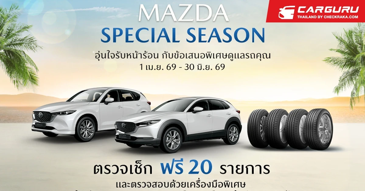 ครั้งนี้ มาสด้าจึงได้จัดแคมเปญ “MAZDA SPECIAL SEASON อุ่นใจรับหน้าร้อน กับข้อเสนอพิเศษดูแลรถคุณ” ชวนลูกค้ามาสด้า นำรถเข้ารับบริการตรวจเช็กฟรี 20 รายการ โดยตรวจสอบด้วยเครื่องมือพิเศษ สำหรับตรวจและวิเคราะห์รถยนต์มาสด้า (M-MDS*) พร้อมมอบข้อเสนอ ผ่อน 0% นานสูงสุด 6 เดือน** (เฉพาะบัตรเครดิตที่ร่วมรายการ) สำหรับลูกค้าที่ซื้อยางรถยนต์ TOYO TIRES และมอบข้อเสนอส่วนลดสูงสุด 5,000 บาท** เมื่อซื้อยางครบทุก 4 เส้น ซึ่งผู้ที่สนใจสามารถสอบถามข้อมูลเพิ่มเติมที่ศูนย์บริการมาสด้าทั่วประเทศ ตั้งแต่วันนี้ ไปจนถึงวันที่ 30 มิถุนายน 2569