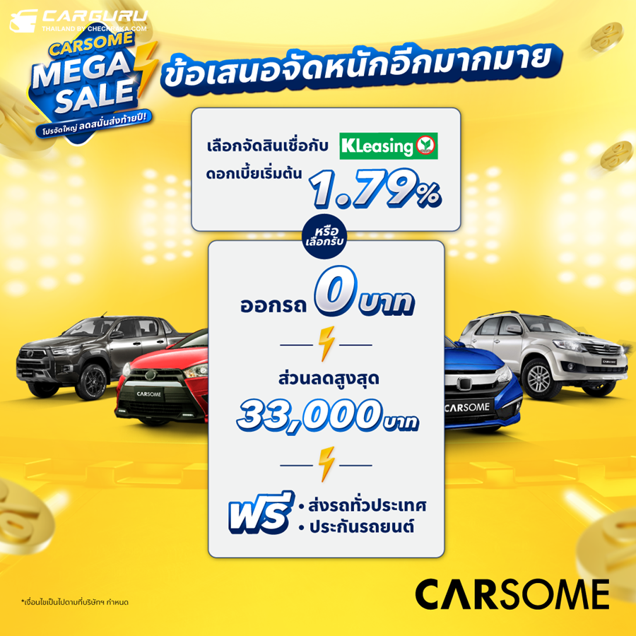 CARSOME แพลตฟอร์มอีคอมเมิร์ซซื้อขายรถยนต์มือสองครบวงจรที่ใหญ่ที่สุดในเอเชียตะวันออกเฉียงใต้ เปิดตัวแคมเปญ CARSOME Mega Sale มอบโปรโมชันสุดพิเศษส่งท้ายปี เอาใจลูกค้าที่กำลังมองหารถยนต์มือสองคุณภาพดี ให้เป็นเจ้าของรถได้ง่ายและสะดวกกว่าที่เคย พร้อมสิทธิพิเศษมากมาย  ทั้งอัตราดอกเบี้ยเริ่มต้นที่ 1.79% จากลีสซิ่งกสิกรไทย และมีสิทธิ์เป็นผู้โชคดีรับรางวัลทองคำเมื่อซื้อรถยนต์กับ CARSOME ตั้งแต่วันที่ 16 พฤศจิกายน -  29 ธันวาคม 2565 นี้