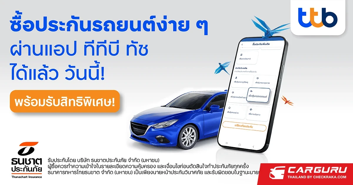 ทีเอ็มบีธนชาต หรือ ทีทีบี เพิ่มช่องทางการจำหน่ายประกันภัยรถยนต์ เพื่อยกระดับประสบการณ์ให้ลูกค้าแอป ttb touch (ทีทีบี ทัช) เข้าถึงบริการได้อย่างสะดวก ปลอดภัย ซื้อง่ายด้วยตนเอง ทำได้ทุกที่ ทุกเวลา โดยสามารถเลือกซื้อประกันภัยรถยนต์ออนไลน์ด้วยตนเองผ่านแอปพลิเคชัน ttb touch ได้แล้ว ทั้งประกันภัยรถยนต์ชั้น 1 และ 2+ พร้อมจัดเต็มโปรโมชันเปิดตัว 3 ต่อ