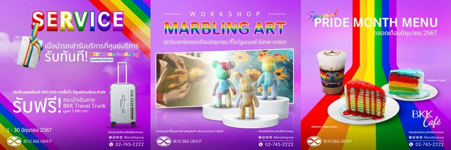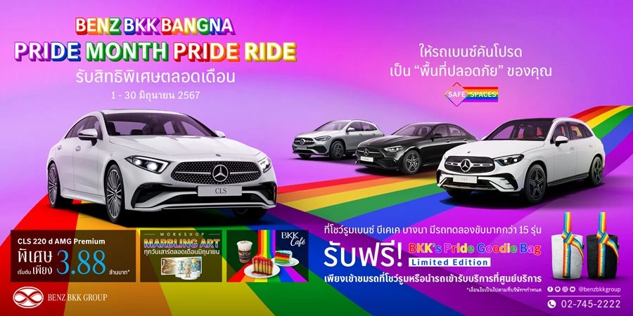 ร่วมเฉลิมฉลองเทศกาล PRIDE MONTH ไปกับแคมเปญ BENZ BKK BANGNA : PRIDE MONTH PRIDE RIDE ได้ตั้งแต่วันนี้ - 30 มิถุนายน 2567 ที่โชว์รูม เบนซ์ บีเคเค บางนา นอกจากนี้ สำหรับลูกค้าที่ใช้รถยนต์ เมอร์เซเดส-เบนซ์ หรือกำลังมองหารถคู่ใจ คันโปรด เบนซ์ บีเคเค บางนา ยังมีดีลพิเศษ พร้อมโปรโมชั่น และกิจกรรมมากมายตลอดเดือนมิถุนายน สอบถามข้อมูลเพิ่มเติมได้ที่ 02-745-2222, Line OA, Facebook, Instagram, YouTube, TikTok : @benzbkkgroup