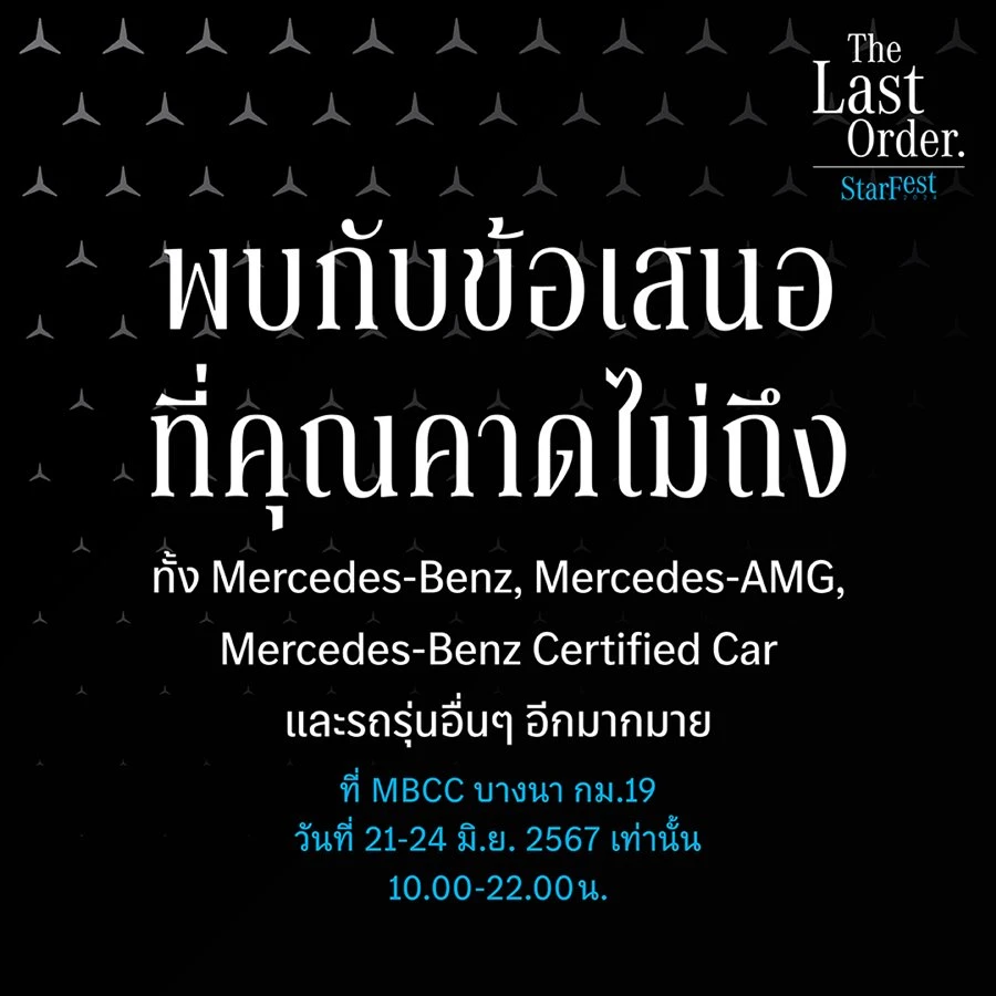 เมอร์เซเดส-เบนซ์ ประเทศไทย ส่งท้ายเทศกาล Mercedes-Benz StarFest 2024 จัดหนักด้วยดีลสุดท้าย StarFest The Last Order ลดราคารถยนต์สูงสุด 900,000 บาท ให้คุณเป็นเจ้าของรถยนต์สมรรถนะสูงตระกูลเอเอ็มจีด้วยราคาเริ่มต้นเพียง 2.68 ล้านบาท นำโดยรุ่น Mercedes-AMG GLA 35 4MATIC และ Mercedes-AMG GLC 43 4MATIC Coupe พร้อมรถยนต์ตระกูลคูเป้อีก 4 รุ่น ได้แก่ C 200 Coupe AMG Dynamic, E 200 Coupe AMG Dynamic, GLC 220 d 4MATIC Coupe AMG และ GLC 300 e 4MATIC Coupe AMG รวมถึงรถยนต์รุ่นอื่นๆ จากเมอร์เซเดส-เบนซ์ และ Mercedes-Benz Certified สำหรับลูกค้าที่เข้ามาที่งาน StarFest The Last Order ณ ศูนย์ MBCC (Mercedes-Benz Competence Centre) ถนนบางนาตราด กม.19 ในระหว่างวันที่ 21 – 24 มิถุนายน 2567 ตั้งแต่เวลา 10.00 – 22.00 น.