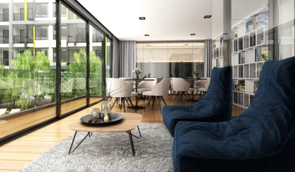 ภาพจำลองบรรยากาศภายในห้องบริเวณพื้นที่นั่งเล่น และพื้นที่รับประทานอาหาร