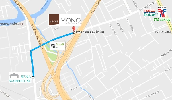 ระยะทางจาก The Niche Mono Sukhumvit 50 ไป SENA Warehouse อยู่ที่ประมาณ 700 ม. หรือขับรถไปแค่ 3 นาที