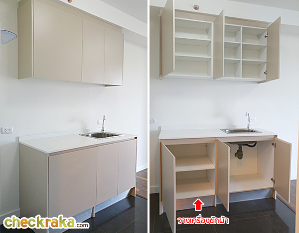 ลิ้นชักใต้เคาน์เตอร์ครัวสามารถถอดออก และทำเป็นที่วางเครื่องซักผ้าได้ตามแบบในภาพ